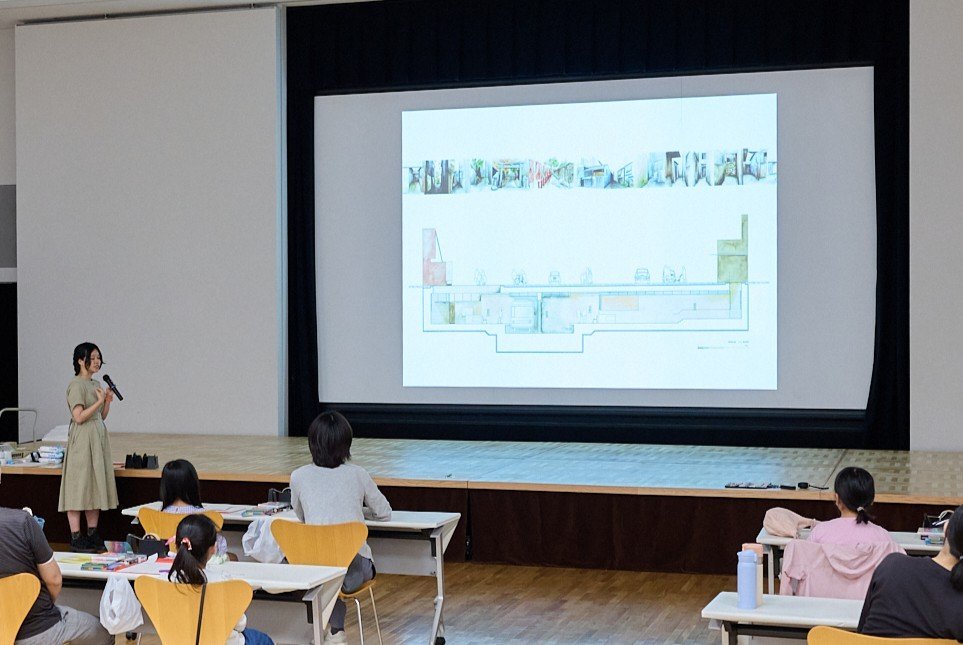 全員で鑑賞し合っていくと、お互いの表現や工夫も知ることができました。ここでワークショップは終了かと思いきや、最後に塩谷さんからサプライズが!この日のために、エントランス部分の図解を描いてくださっていました。