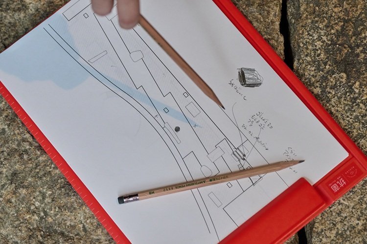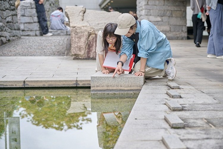 少しずつ感覚がひらかれはじめたところで、場所を変え「水と石のプロムナード」に訪れました。ここでは塩谷さんがトレースしてくださった平面図(白地図)を手に、気付いたこと、感じたことを各自でメモしていきます。