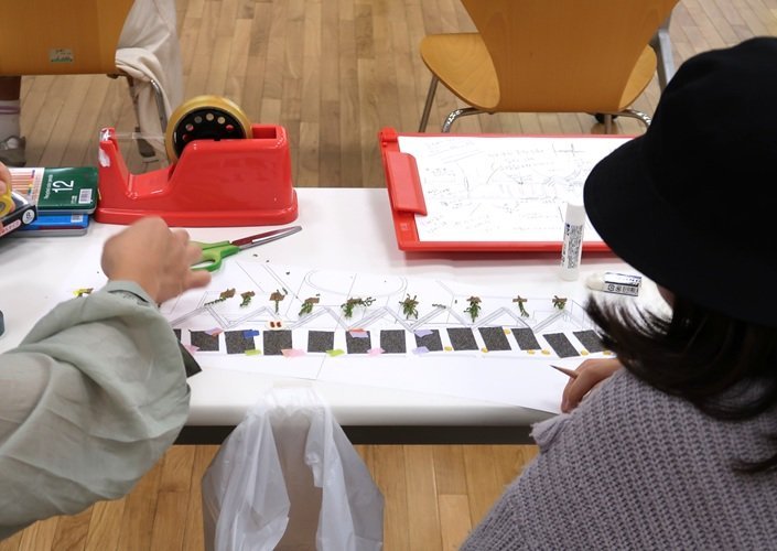 - 床のザラザラした質感をシールで、人を棒人間、マスキングテープで表現した。