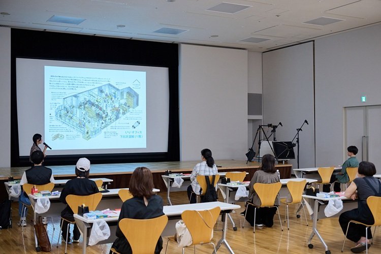 はじめに、塩谷さんから自己紹介がありました。塩谷さんは、アイソメトリックと呼ばれる建築図法を用いて建物の図解を描いています。これまでに描いた作品を画像で見せながら、描く際の工夫も教えてくださいました。
