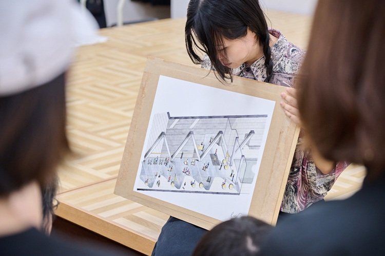 全員で鑑賞し合っていくと、お互いの表現や工夫も知ることができました。ここでワークショップは終了かと思いきや、最後に塩谷さんからサプライズが!この日のために、エントランス部分の図解を描いてくださっていました。