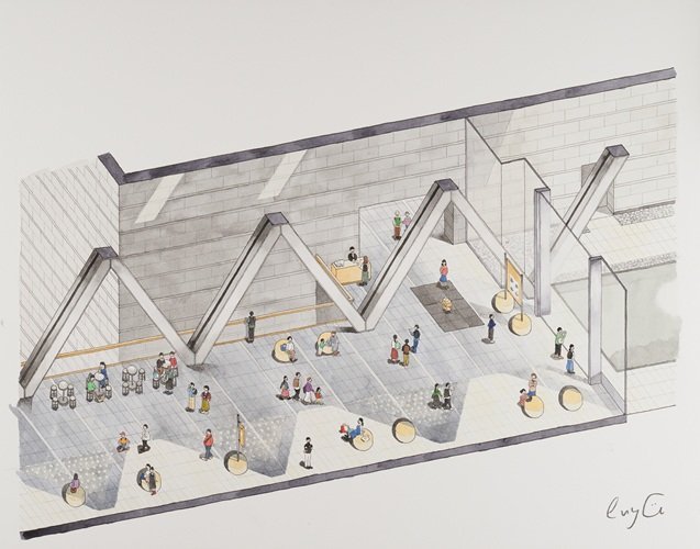 - 窓のドットや丸みのあるオブジェなど、丸が印象的だった。エントランスを歩いていると宙に浮いている感じがしたので、その感覚を誇張して雲を描いた。
