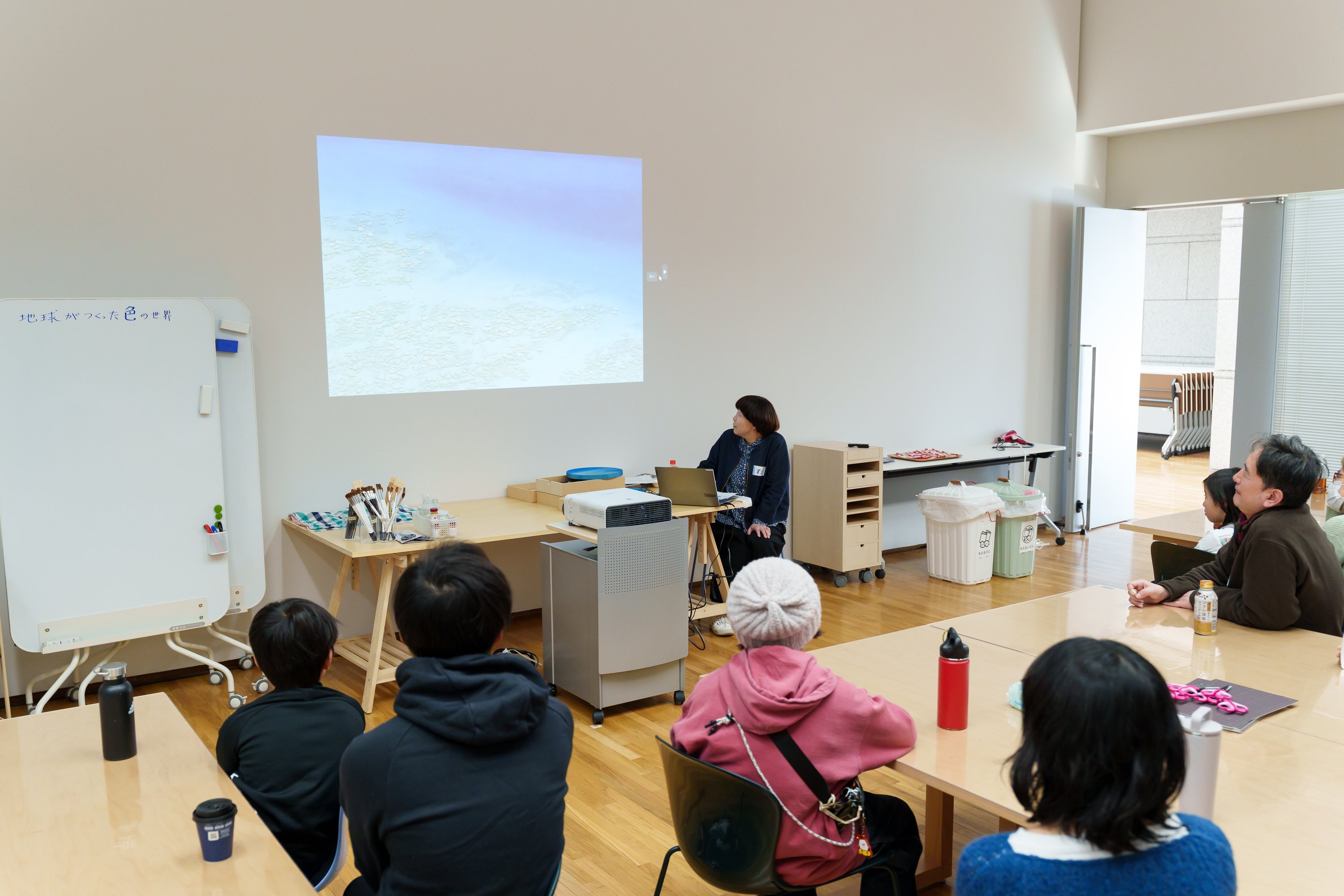 今回は、岩絵具の他、自作の絵具や砂、泥絵具と樹脂膠を混ぜた描画材料などを使って独自の画面を構築している画家の須惠朋子さんを講師にお迎えし、地球が長い時間をかけて作り出した自然の色を知ると共に、地球上にある素朴で美しい色を体験するワークショップを実施しました。(実施日時 2月8日(土)10:30~15:30)