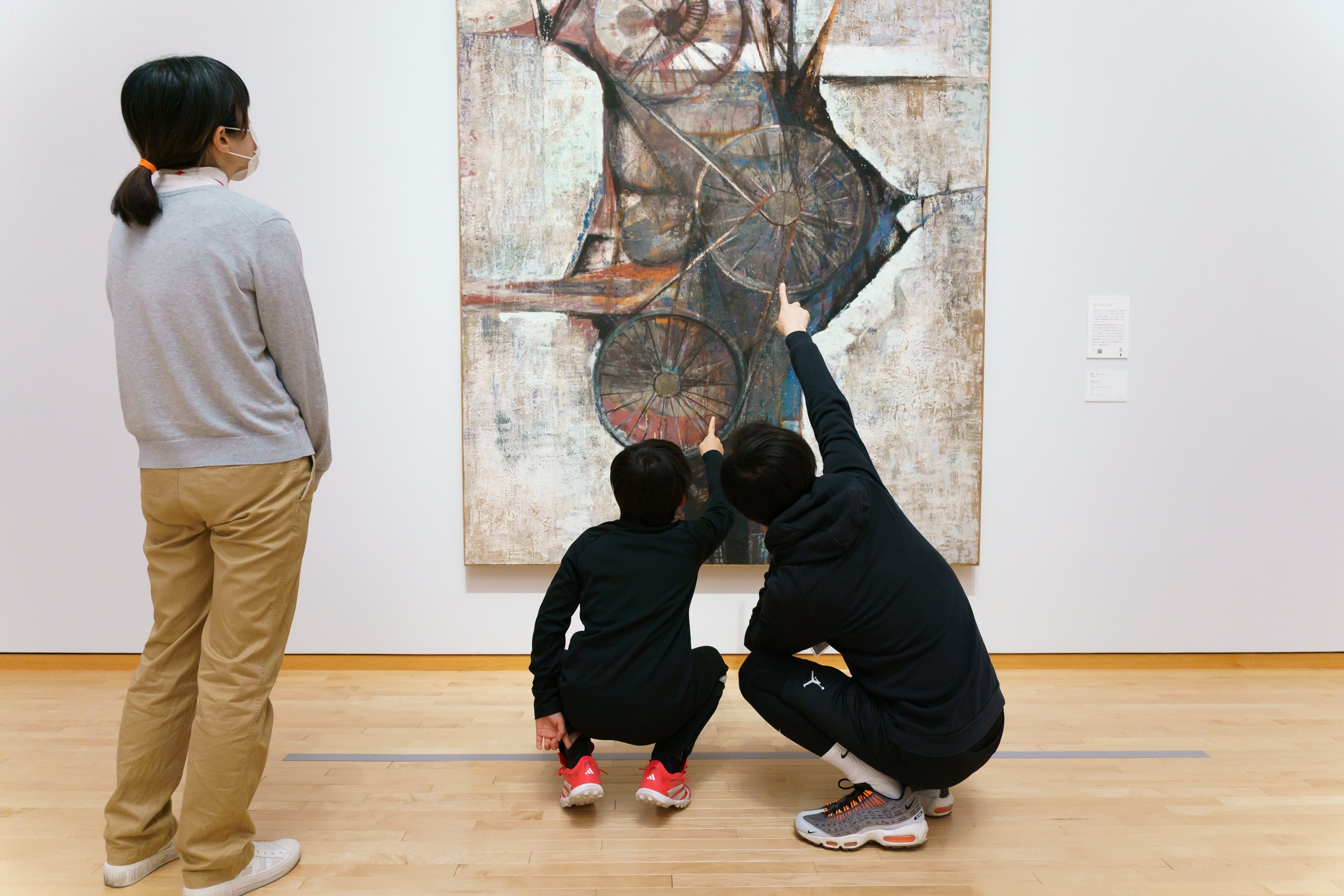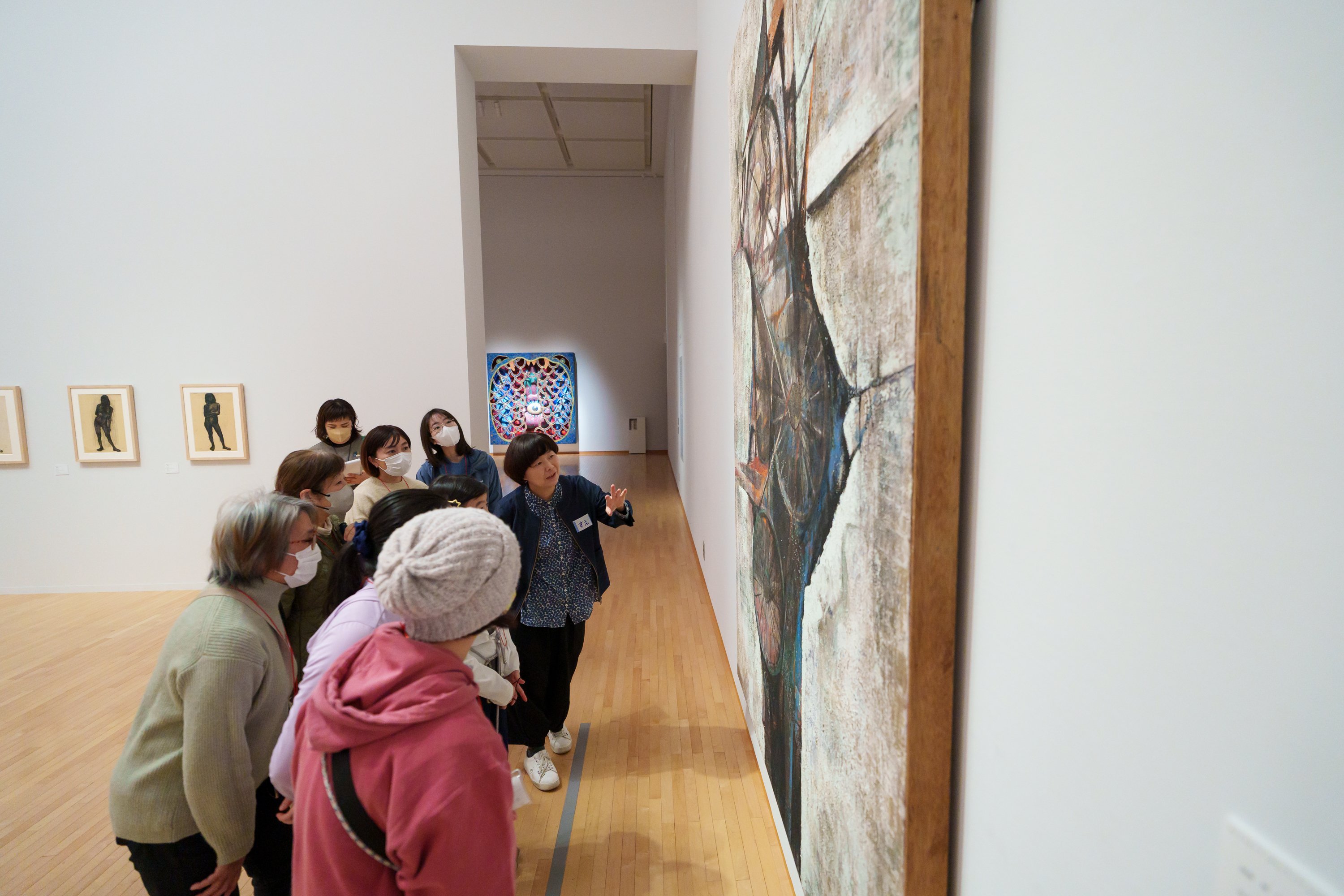 今期のMOTコレクションでは、朝倉摂による日本画の作品が展示されています。「今回展示されている朝倉摂の作品は、顔料や焼いた箔などが使われています。何を使って絵が描かれているかに注目して見てください」との話を受けて、それぞれで作品を良く観察します。