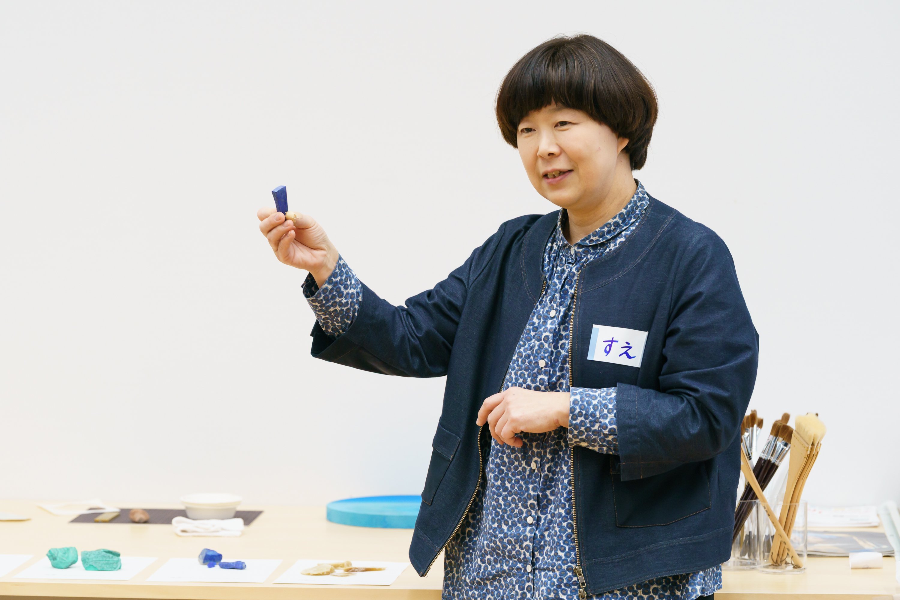 現美作成の色の触察ツールを使って、ラピスラズリや緑青、辰砂といった鉱石の説明も。参加者の中には、鉱石が大好き!という方も多く、須惠さんからの鉱石に関するお話に深くうなずきながら聞いていらっしゃる方もいました。