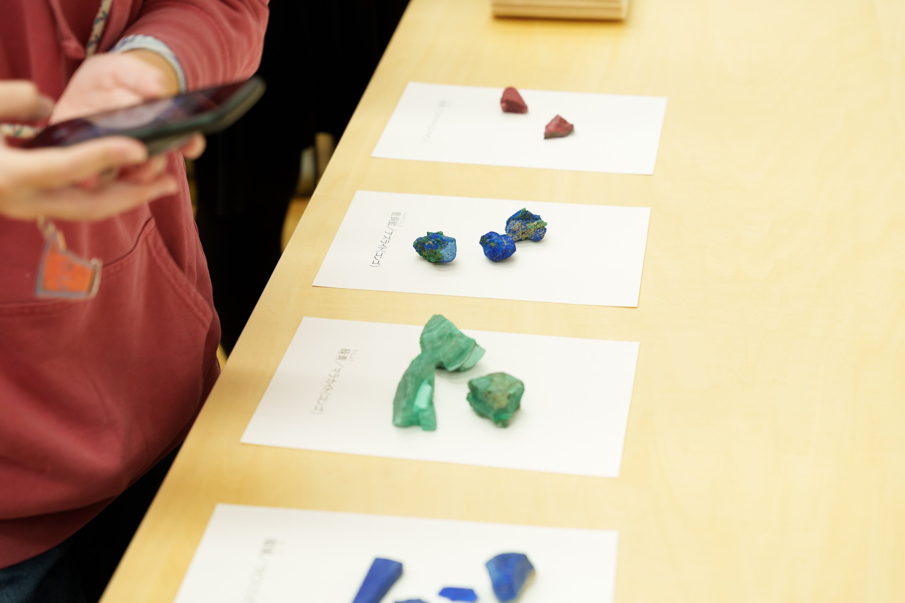 前方の素材机の上にあった布が取り払われると、アズライトやラピスラズリ、マラカイト、雲母、辰砂といった、色鮮やかな石が! 美術館の色を削り出した後は、地球がつくり出した色とりどりの石を試していきます。数に限りがあるので、融通しつつ順番に好きな石を使って削り出していきます。