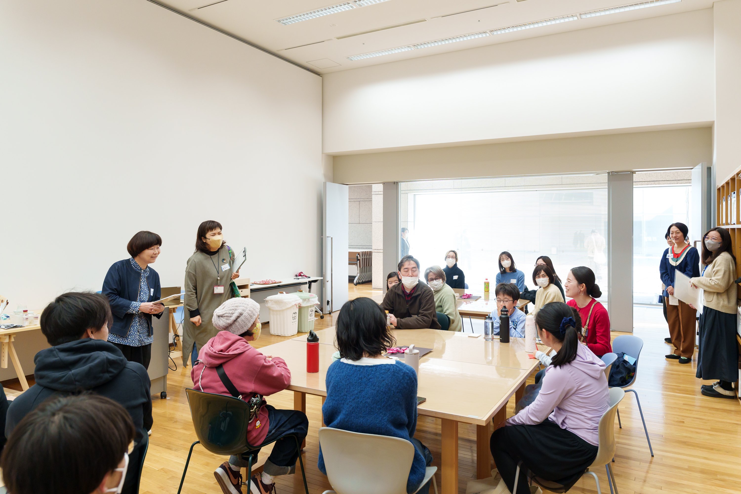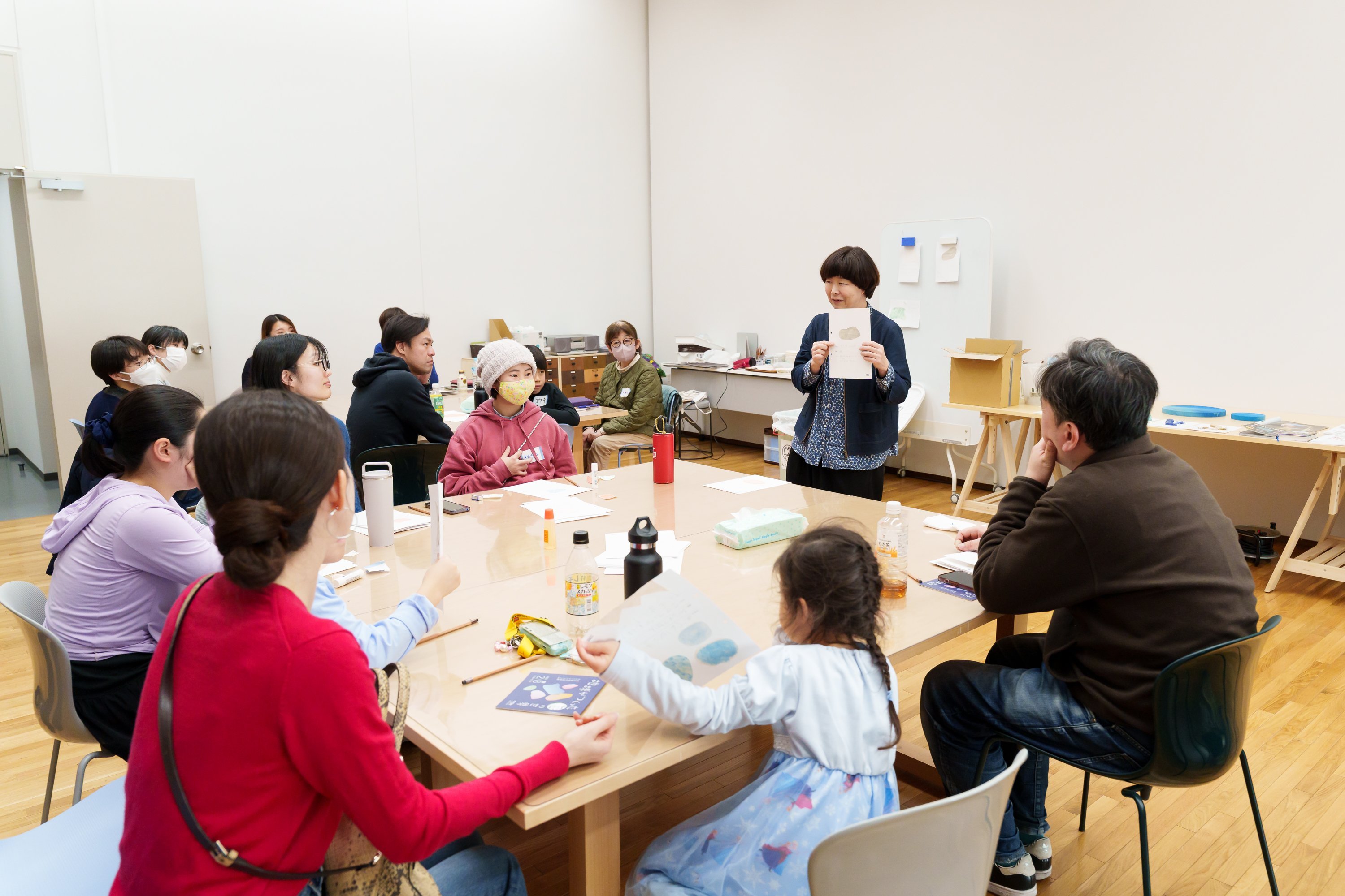 ワークショップには、小学生と保護者のペアから大人まで、幅広い世代にわたる19名が参加しました。スタジオを会場に、半日にわたって時をともにする参加者同士、自己紹介をするところからスタート!