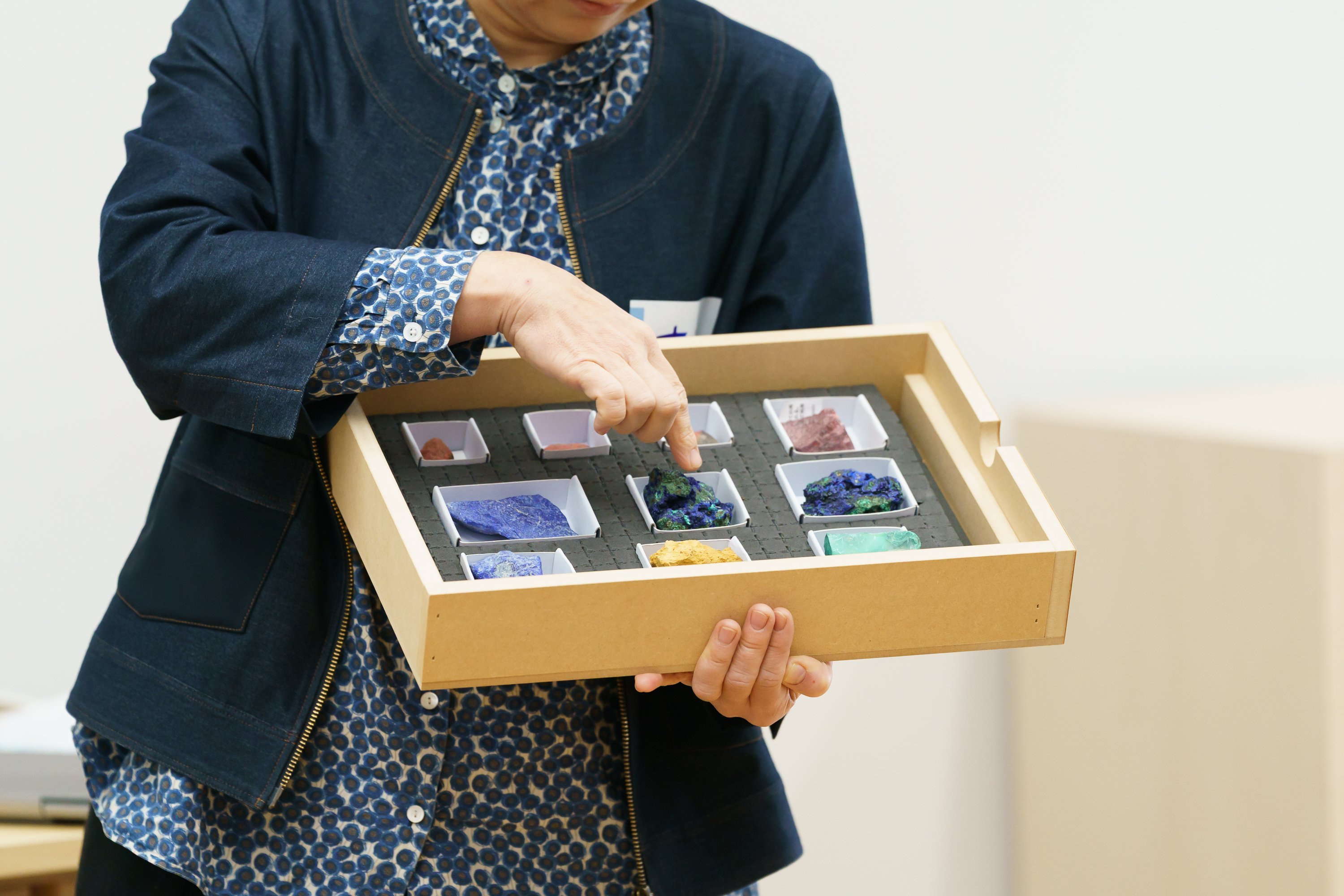 現美作成の色の触察ツールを使って、ラピスラズリや緑青、辰砂といった鉱石の説明も。参加者の中には、鉱石が大好き!という方も多く、須惠さんからの鉱石に関するお話に深くうなずきながら聞いていらっしゃる方もいました。