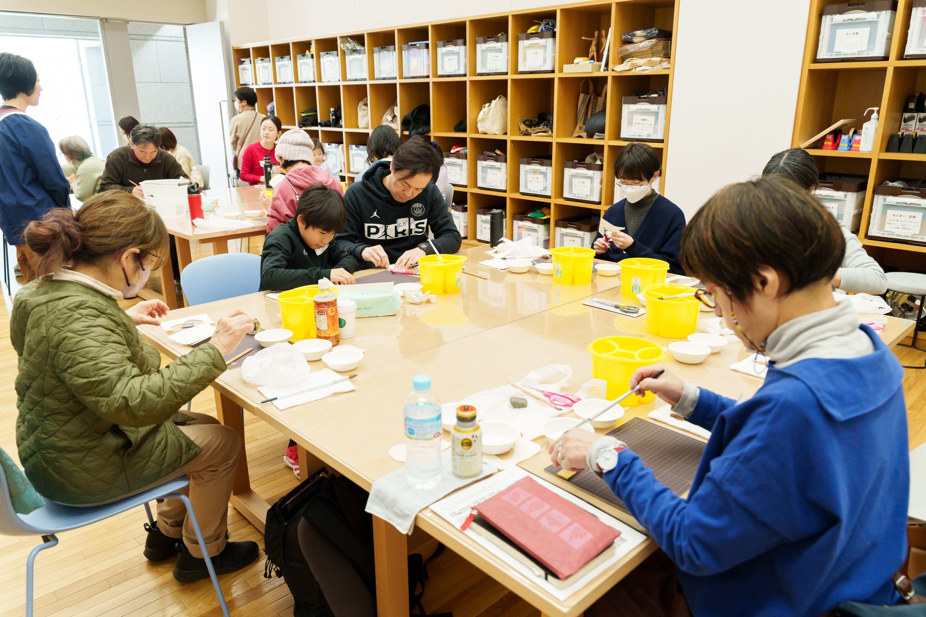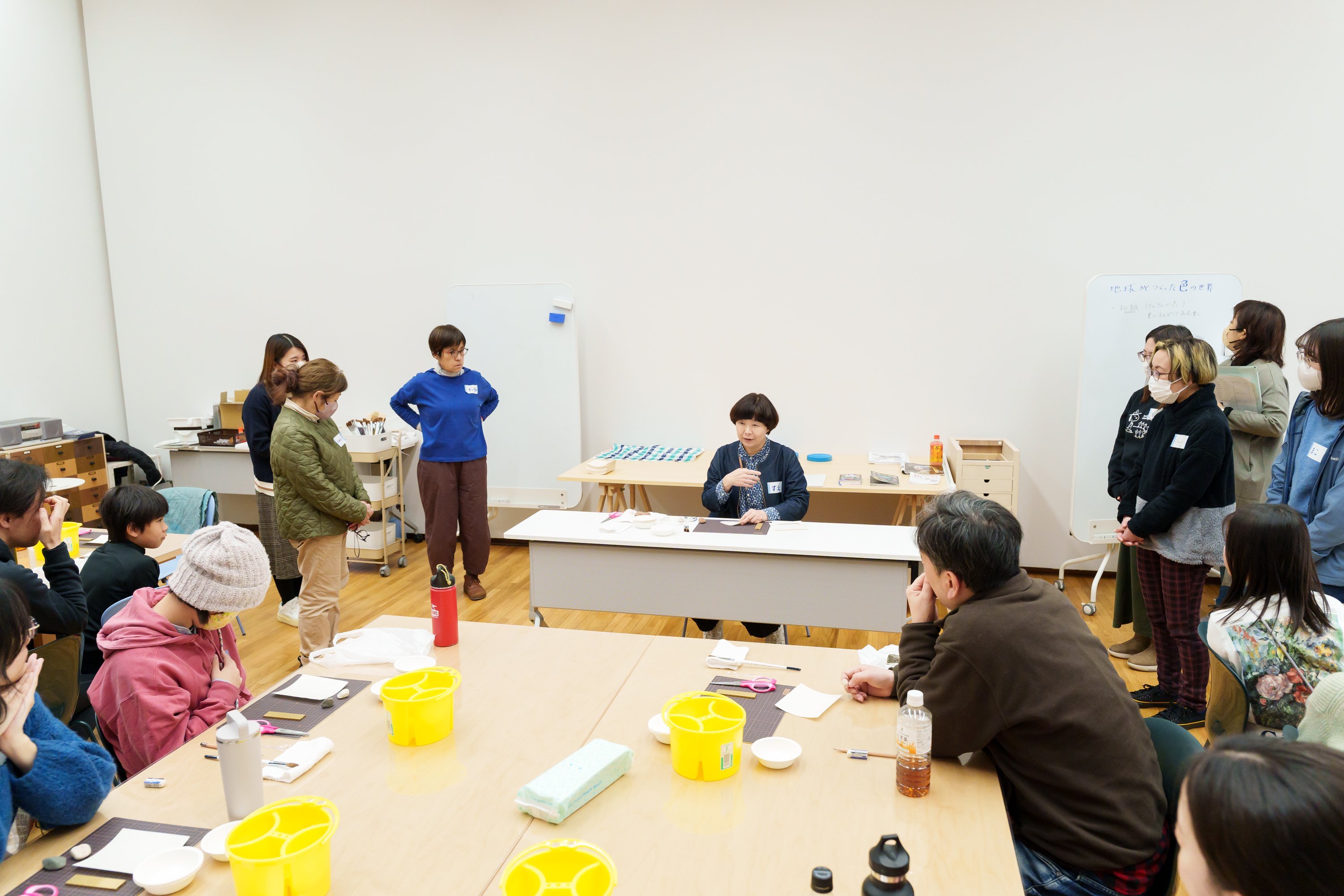 今回は、岩絵具の他、自作の絵具や砂、泥絵具と樹脂膠を混ぜた描画材料などを使って独自の画面を構築している画家の須惠朋子さんを講師にお迎えし、地球が長い時間をかけて作り出した自然の色を知ると共に、地球上にある素朴で美しい色を体験するワークショップを実施しました。(実施日時 2月8日(土)10:30~15:30)