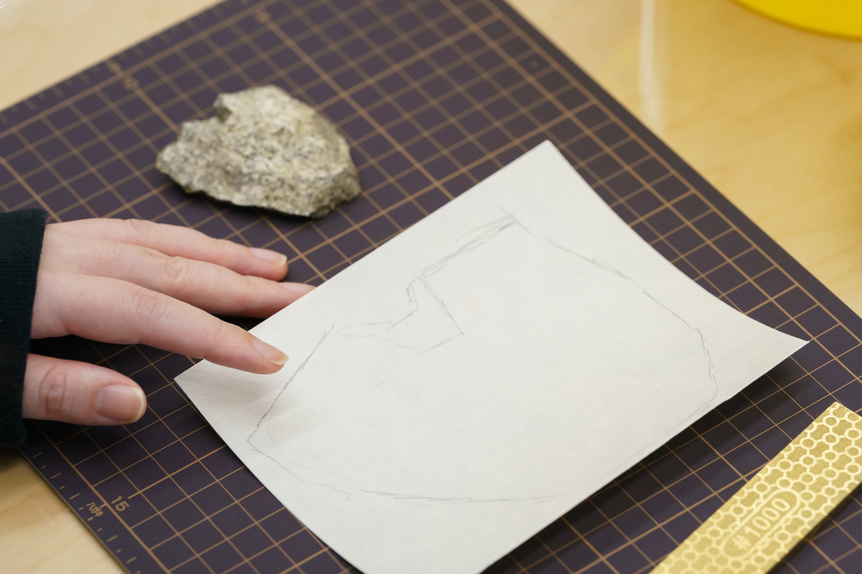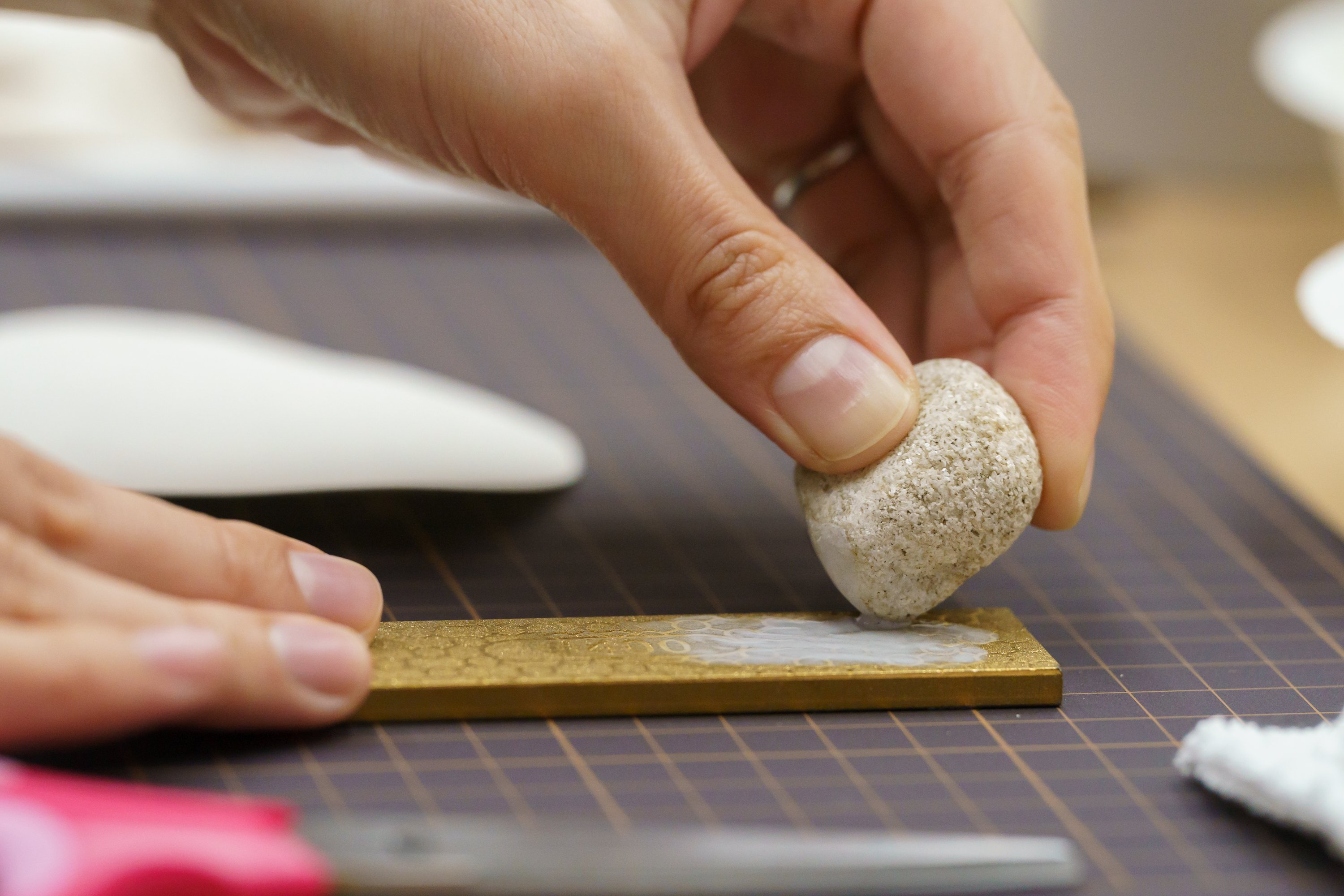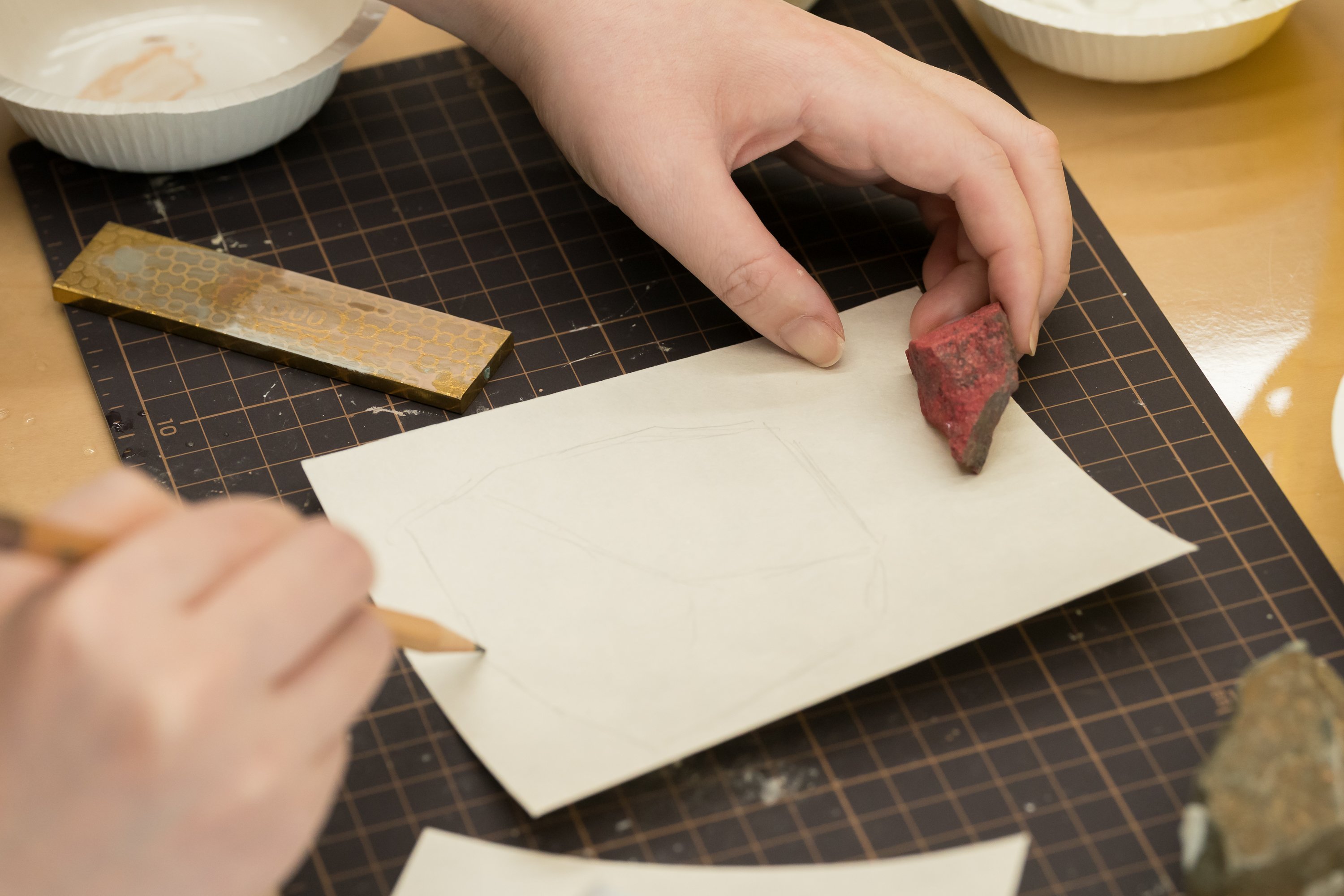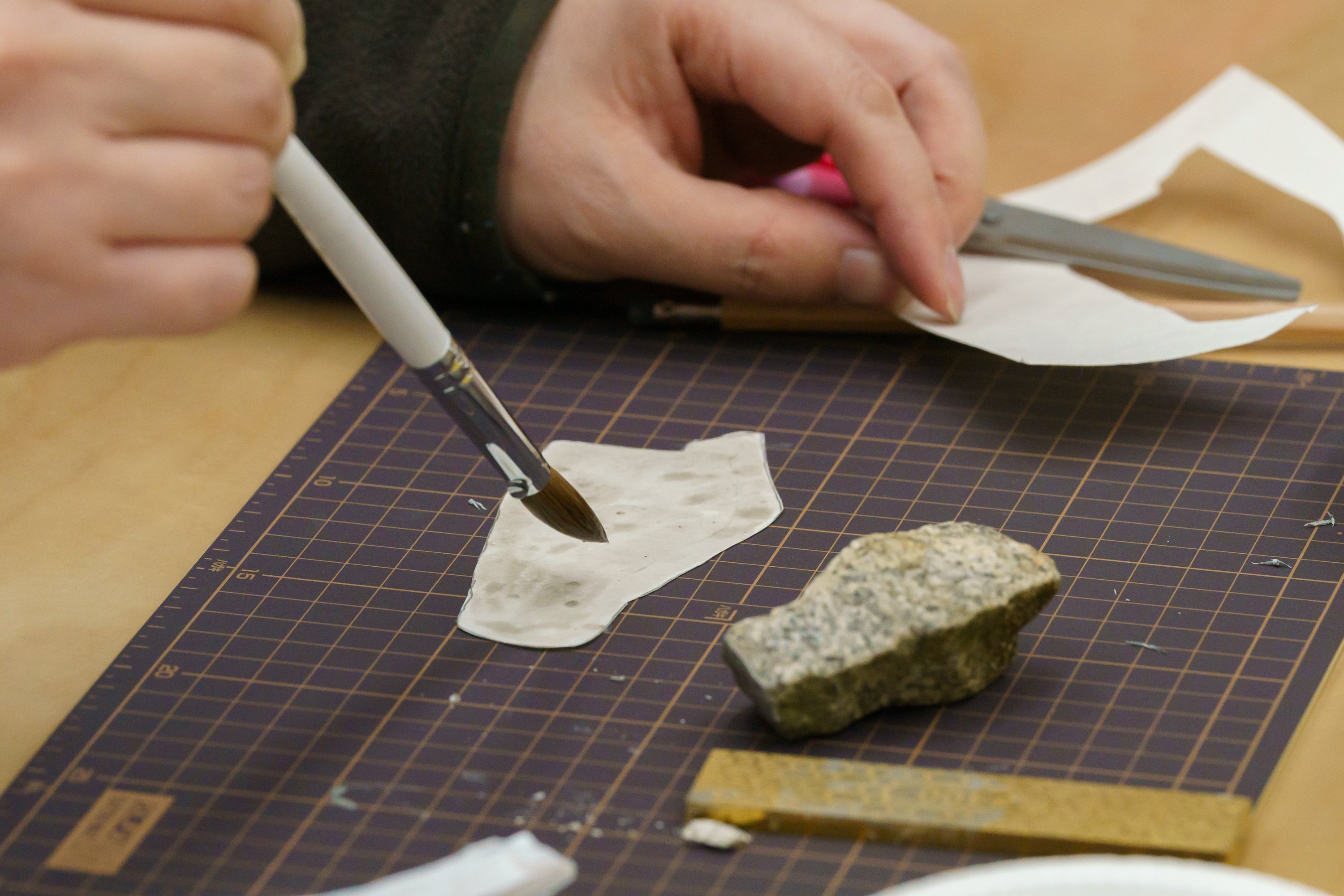 須惠さんより一連の作業の説明です。ダイアモンド砥石を使って石を削り、出てきた色に膠を混ぜて和紙に塗る*、という流れです。和紙は四角いまま使うのではなく、拾ってきた石の形にカットして、色を塗っていきます。
