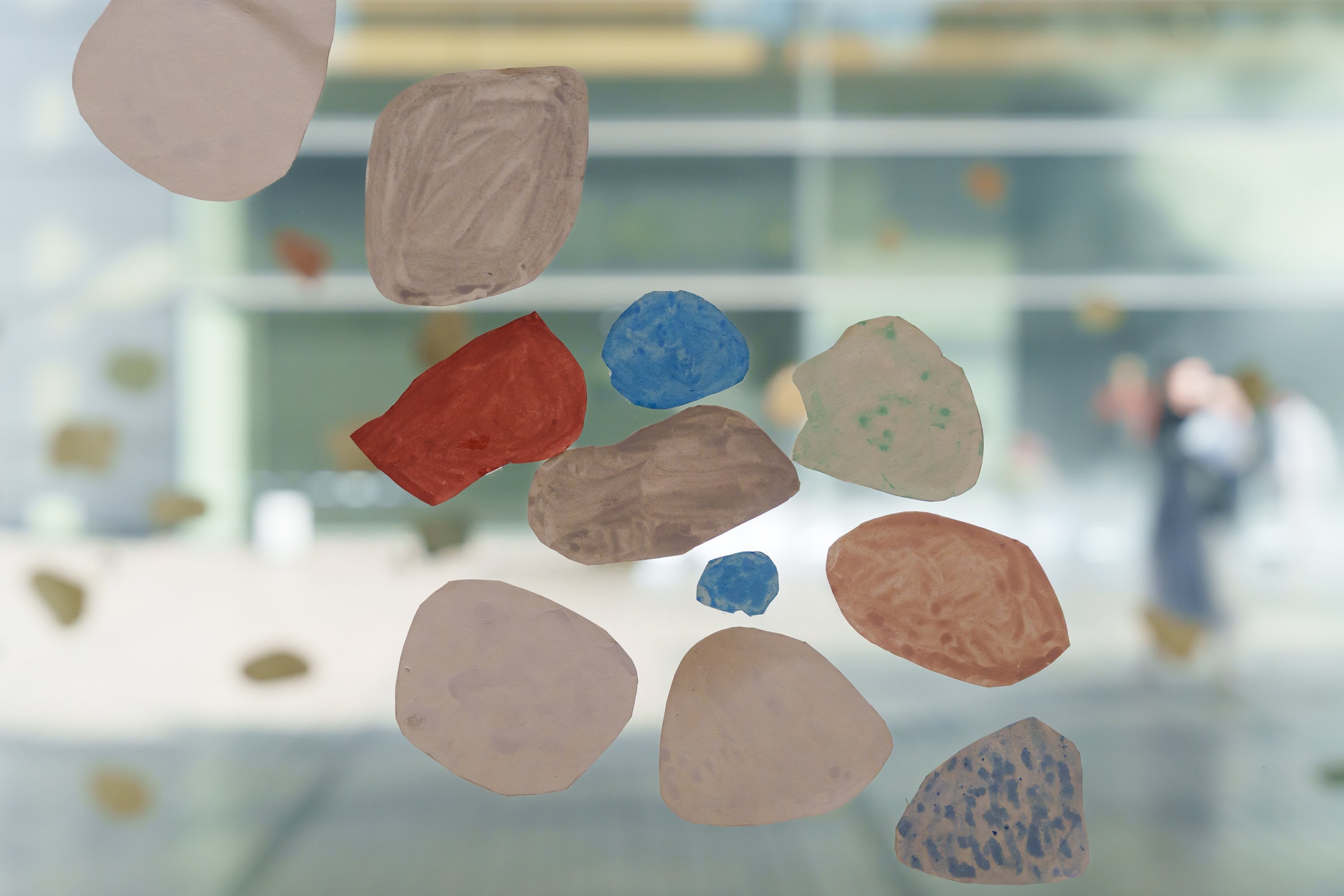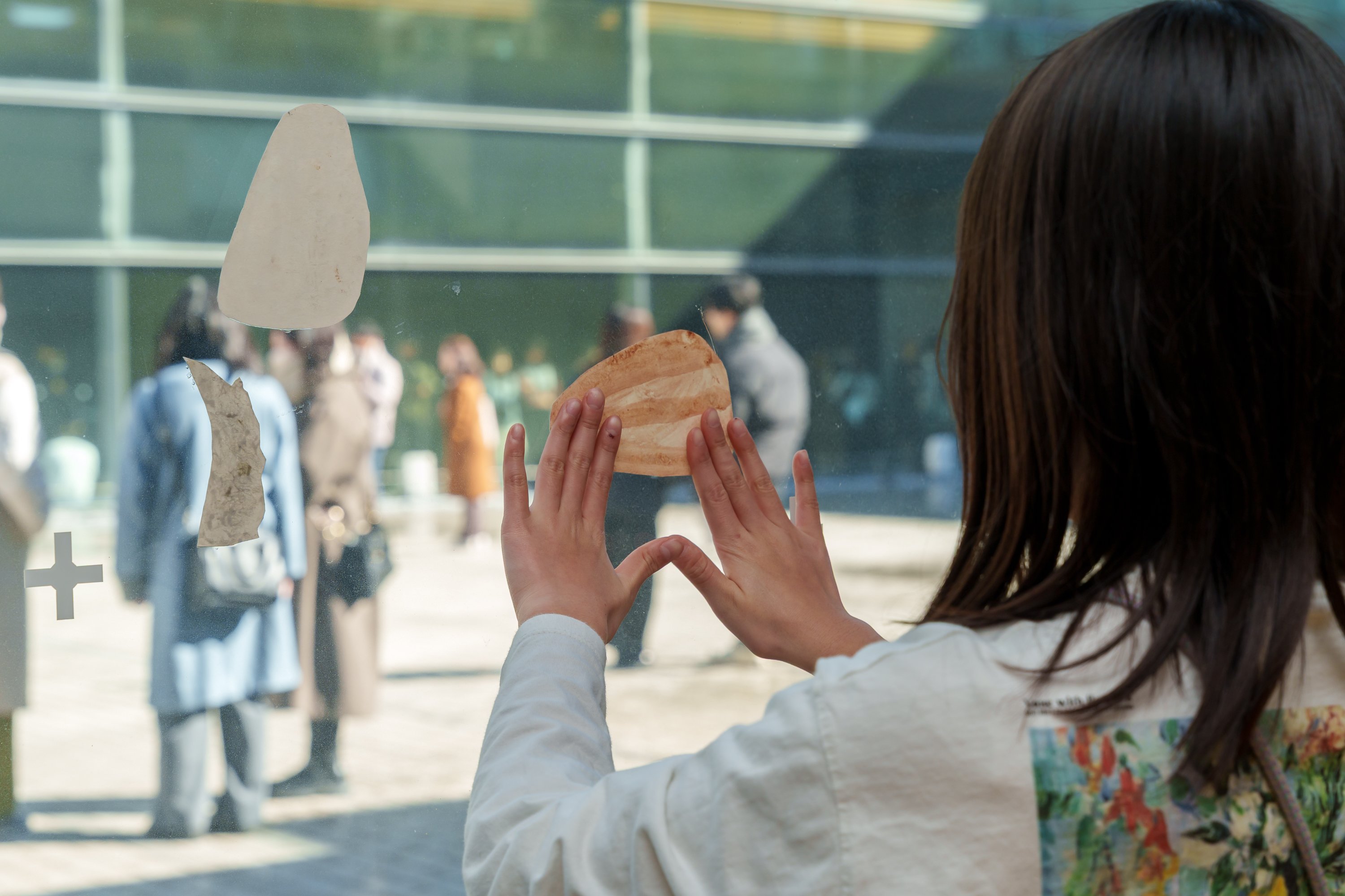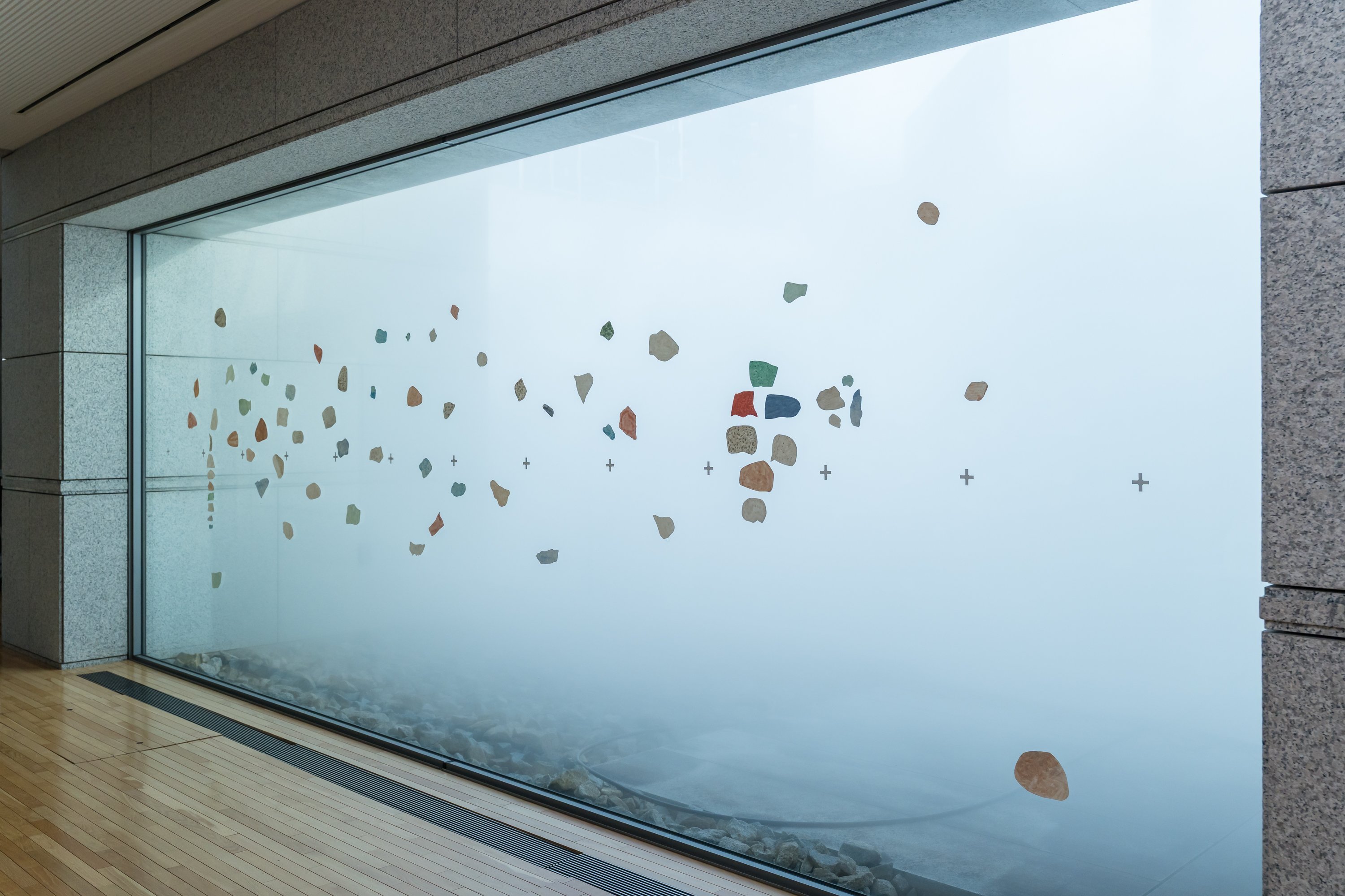 削り出した色を塗った紙をガラス越しに貼っての鑑賞は、まさに一期一会。天気や時間によって移り変わる光の調子や、美術館の建物を背景に常に形を変える霧の彫刻と共に見た色のコラージュ作品は、今日という日のその瞬間だからこそ出会えた色の世界です。