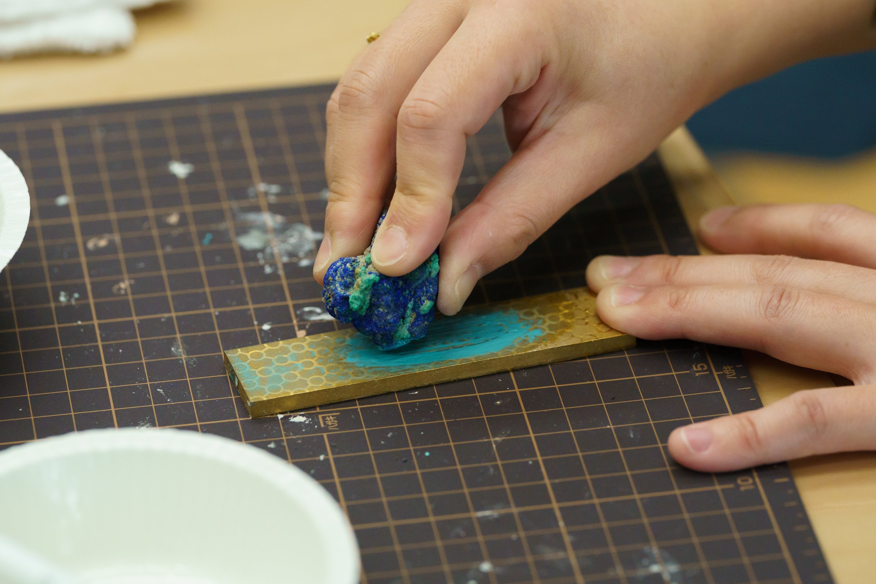 前方の素材机の上にあった布が取り払われると、アズライトやラピスラズリ、マラカイト、雲母、辰砂といった、色鮮やかな石が! 美術館の色を削り出した後は、地球がつくり出した色とりどりの石を試していきます。数に限りがあるので、融通しつつ順番に好きな石を使って削り出していきます。