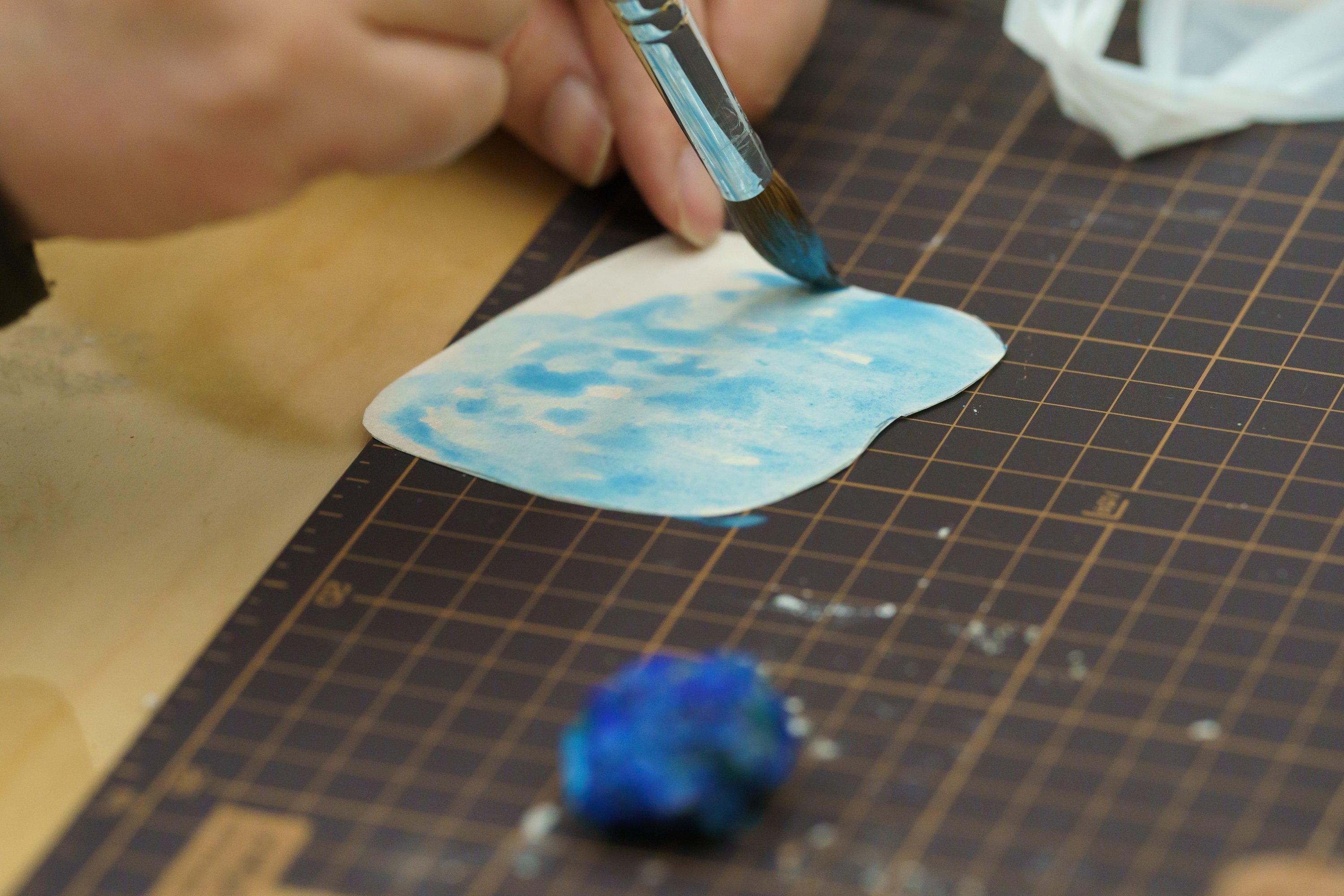 原石の色、水を加えて削り出した色、紙に塗りたての色、乾いた色、ガラス面に貼って見える色とそれぞれの過程で感じる色味が違います。約2時間にわたる色づくりの時間はあっという間に過ぎていきました。