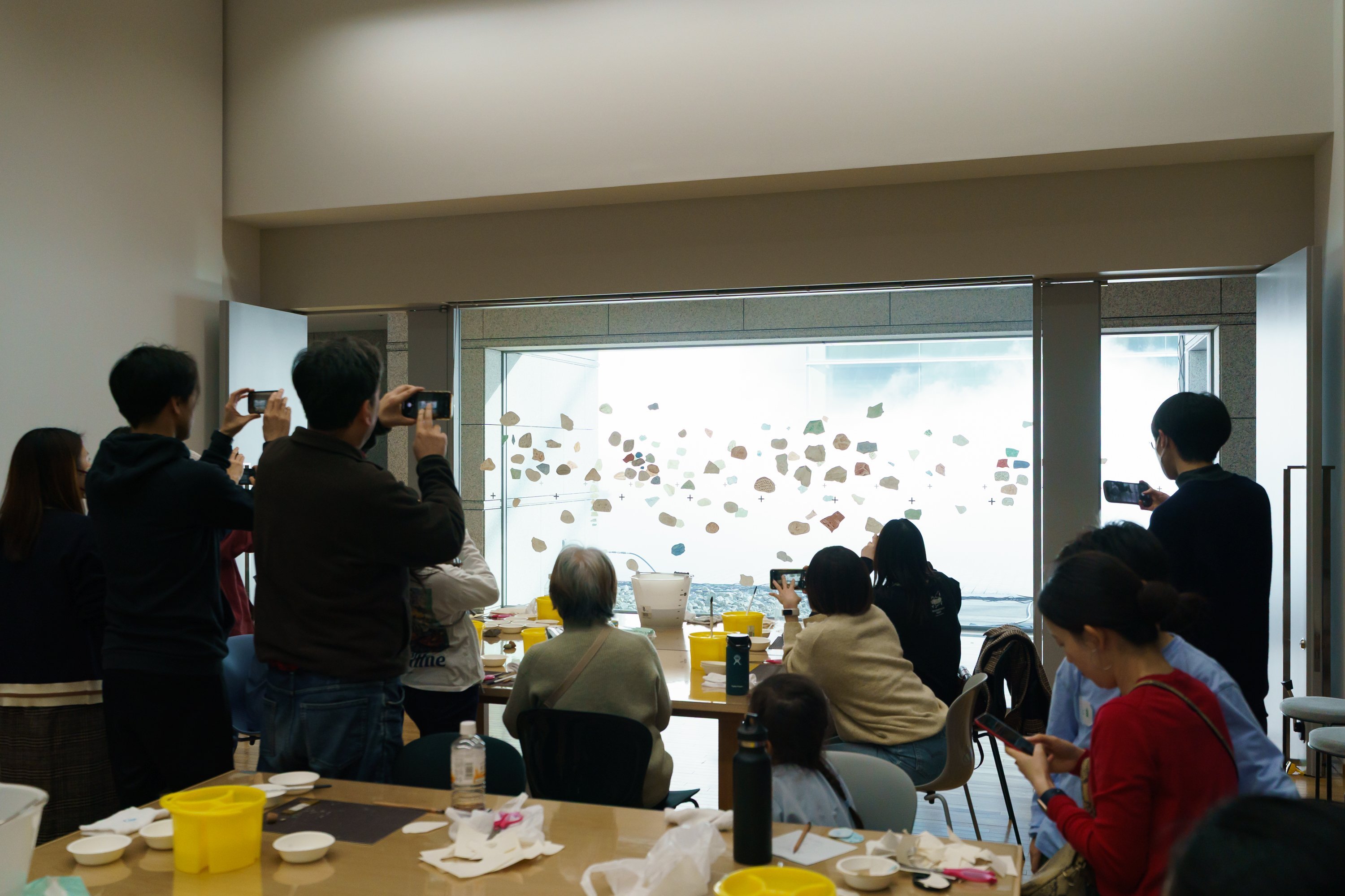 ある程度紙の表面が乾いたら、スタジオと外廊下のガラス面に貼っていきます。今日は参加者全員で大きなガラス面を支持体にした巨大な色のコラージュを作っていきます。