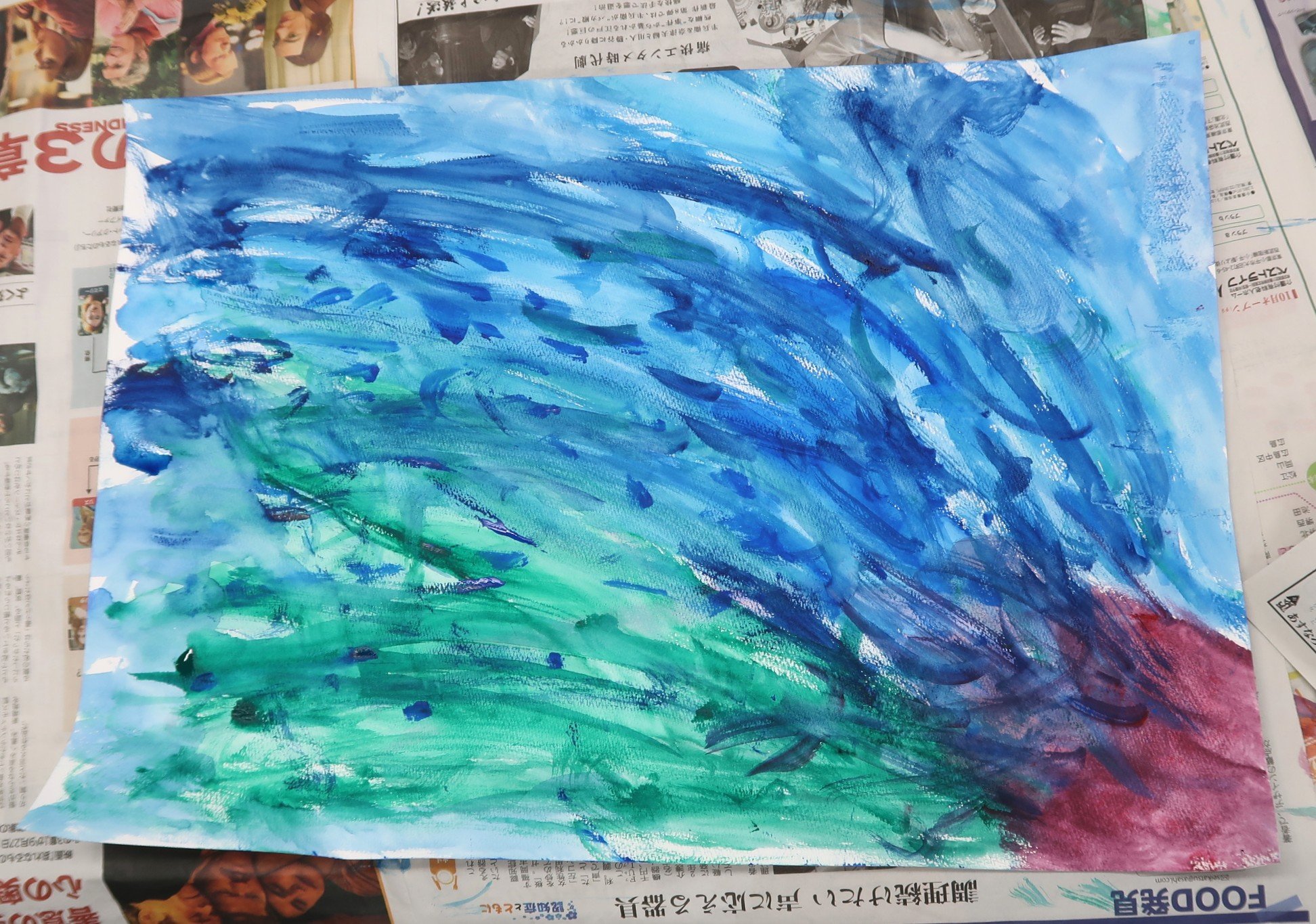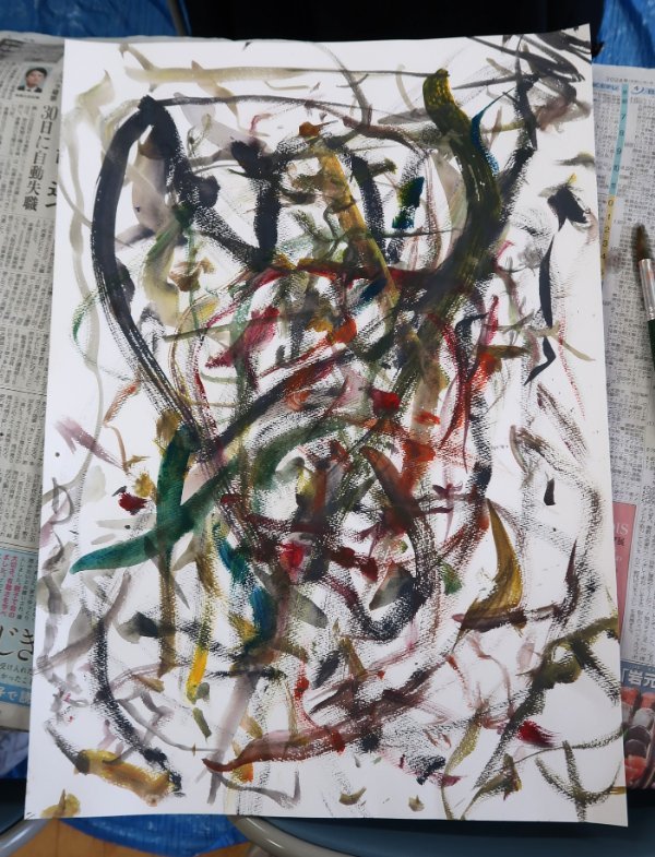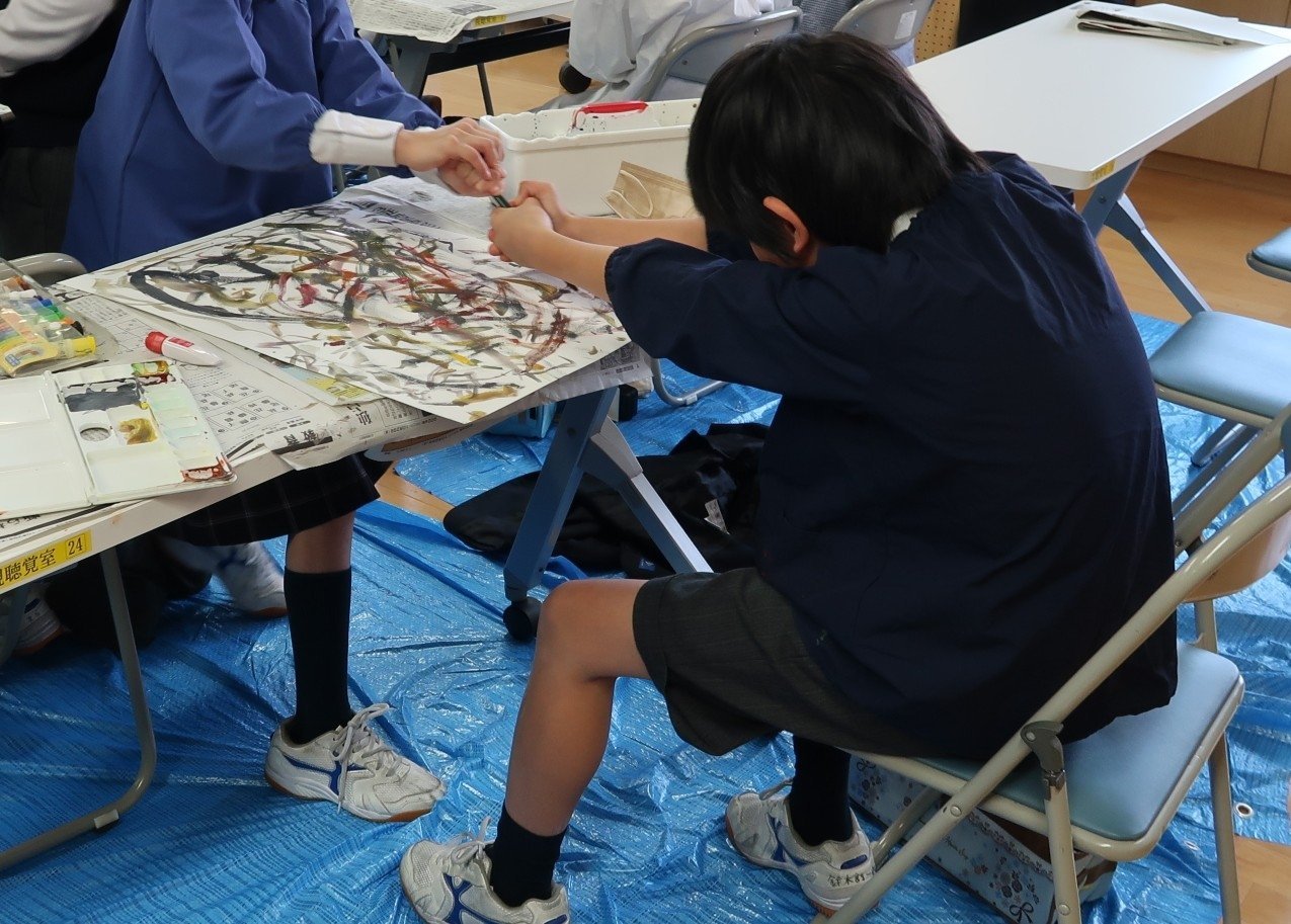 児童曰く、「平和に見せかけた支配」だそうです。二人とも筆を力いっぱい引っ張り合って本気で抗いながら手を動かしていました。色や筆跡からもその様子が伝わってきます。