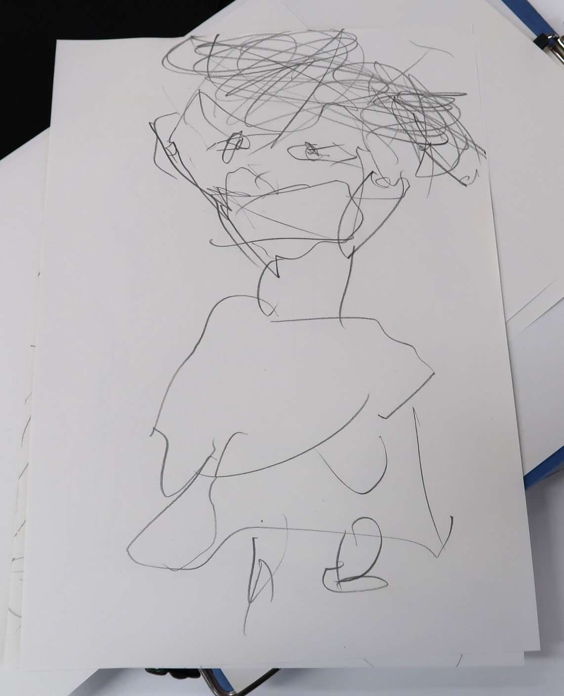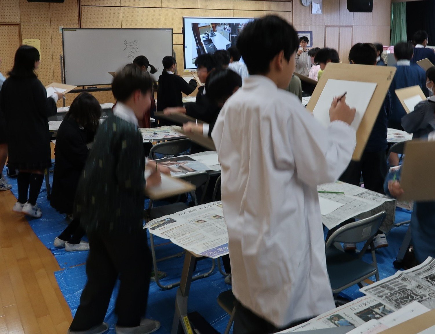 児童たちは与えられた1分間で、ジャンプしながら必死にペアの相手を描いています。その表情からは楽しんでいる様子が伝わってきました。