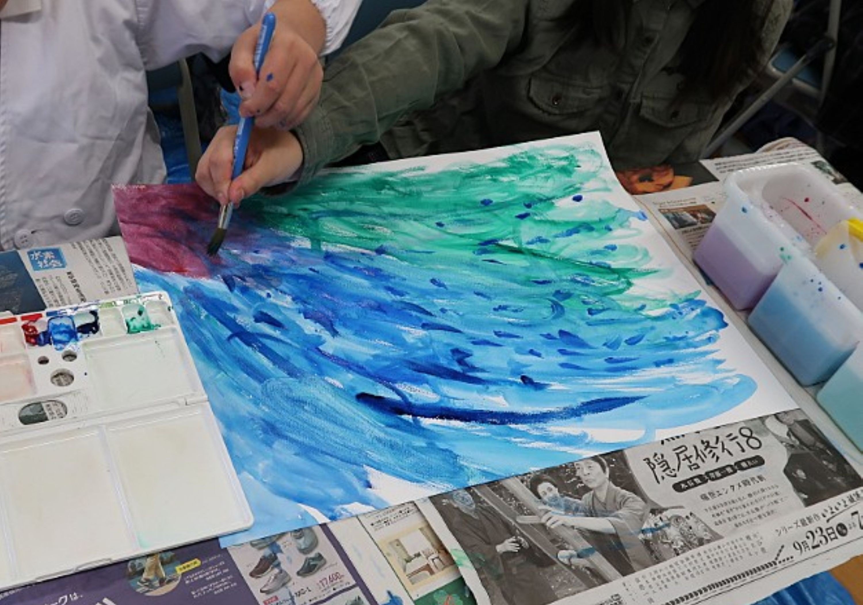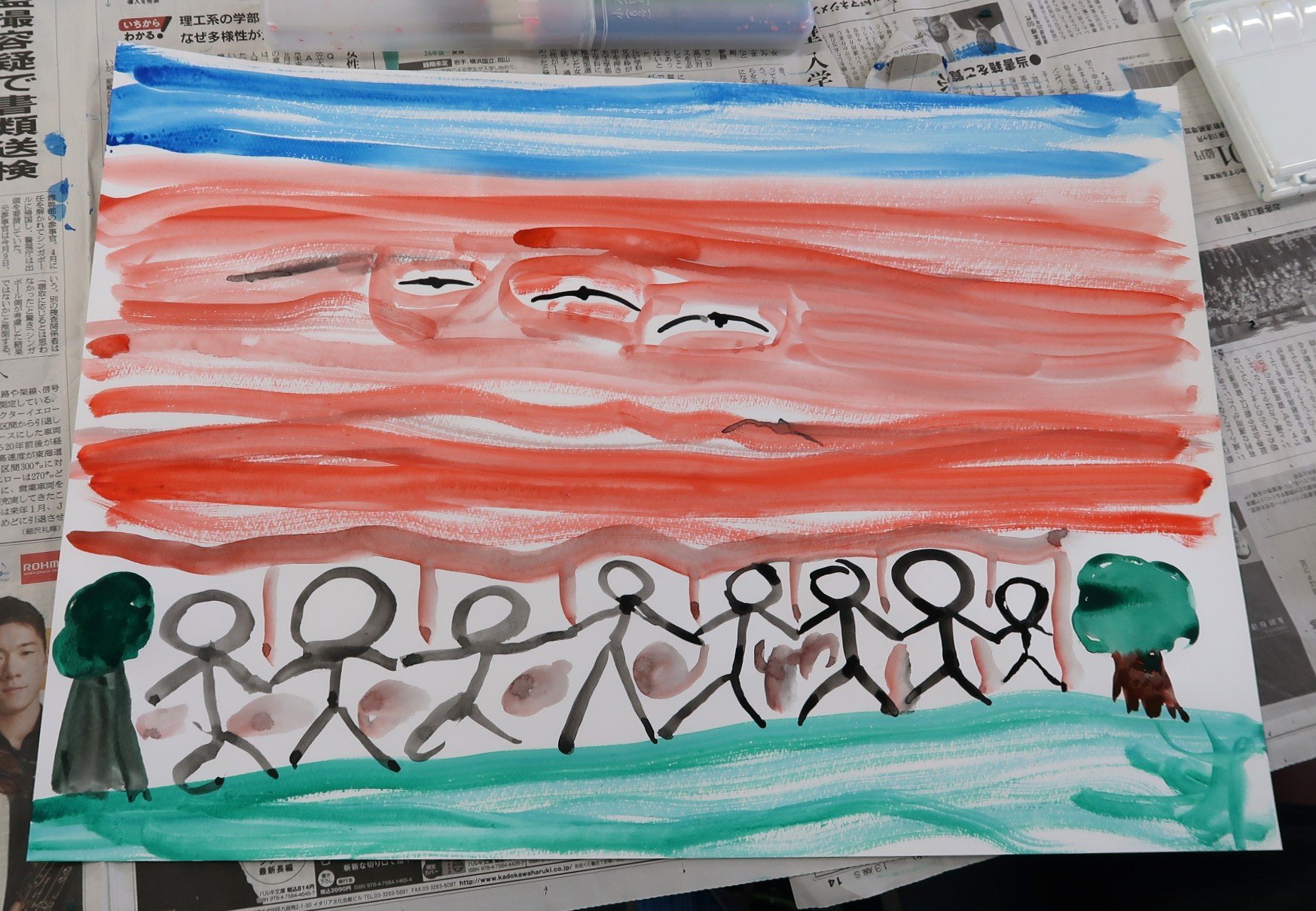 手と手を取り合っている人たちが描かれ、「国のつながり」を表現した作品。このペアは相手の呼吸に合わせながら筆をゆっくり動かして描いていました。
