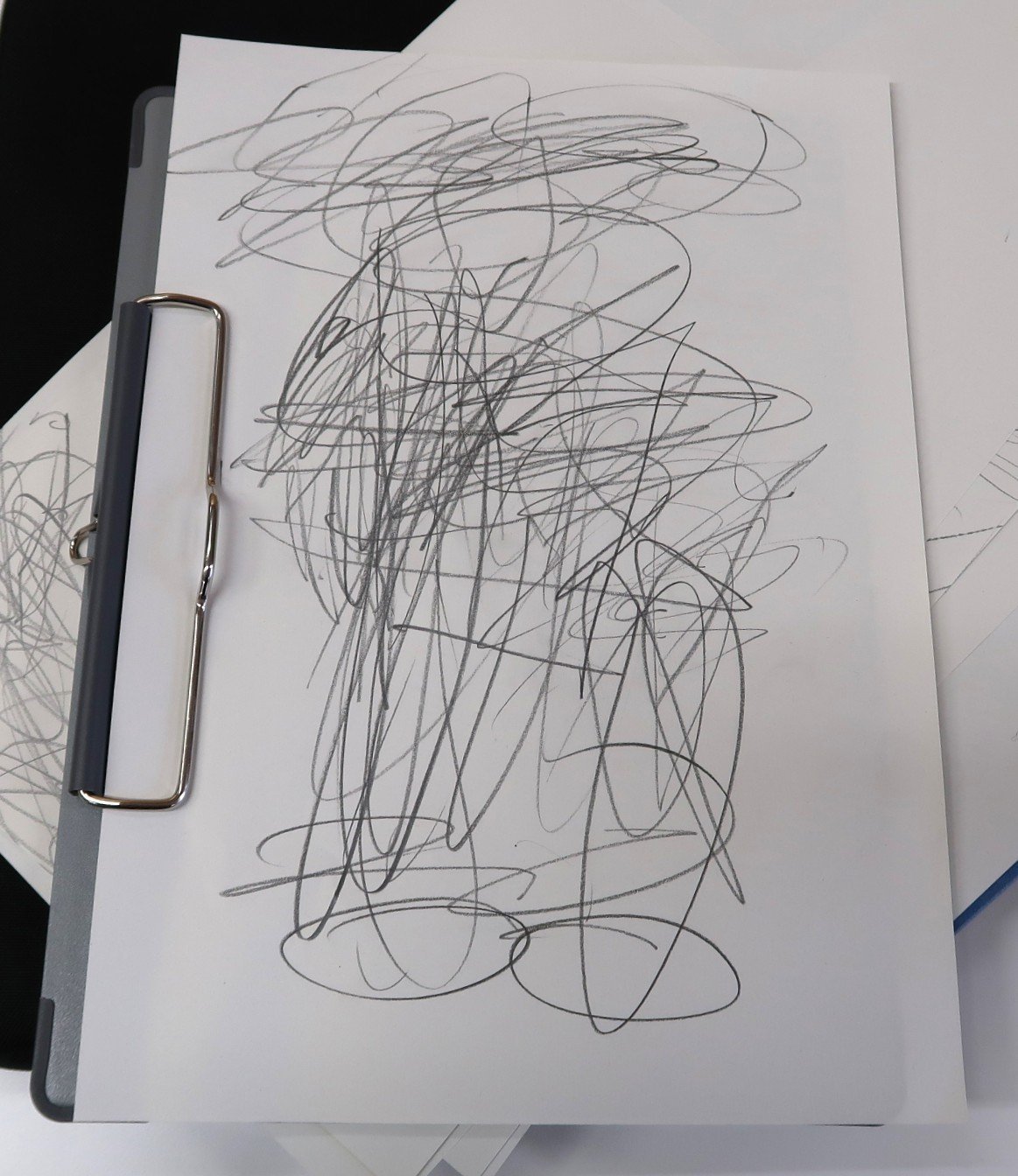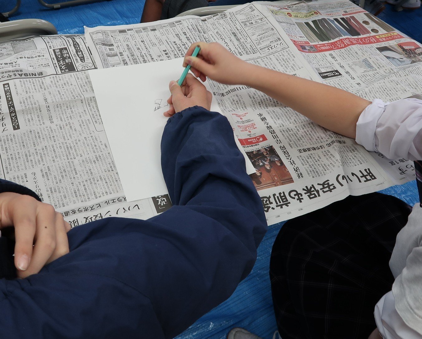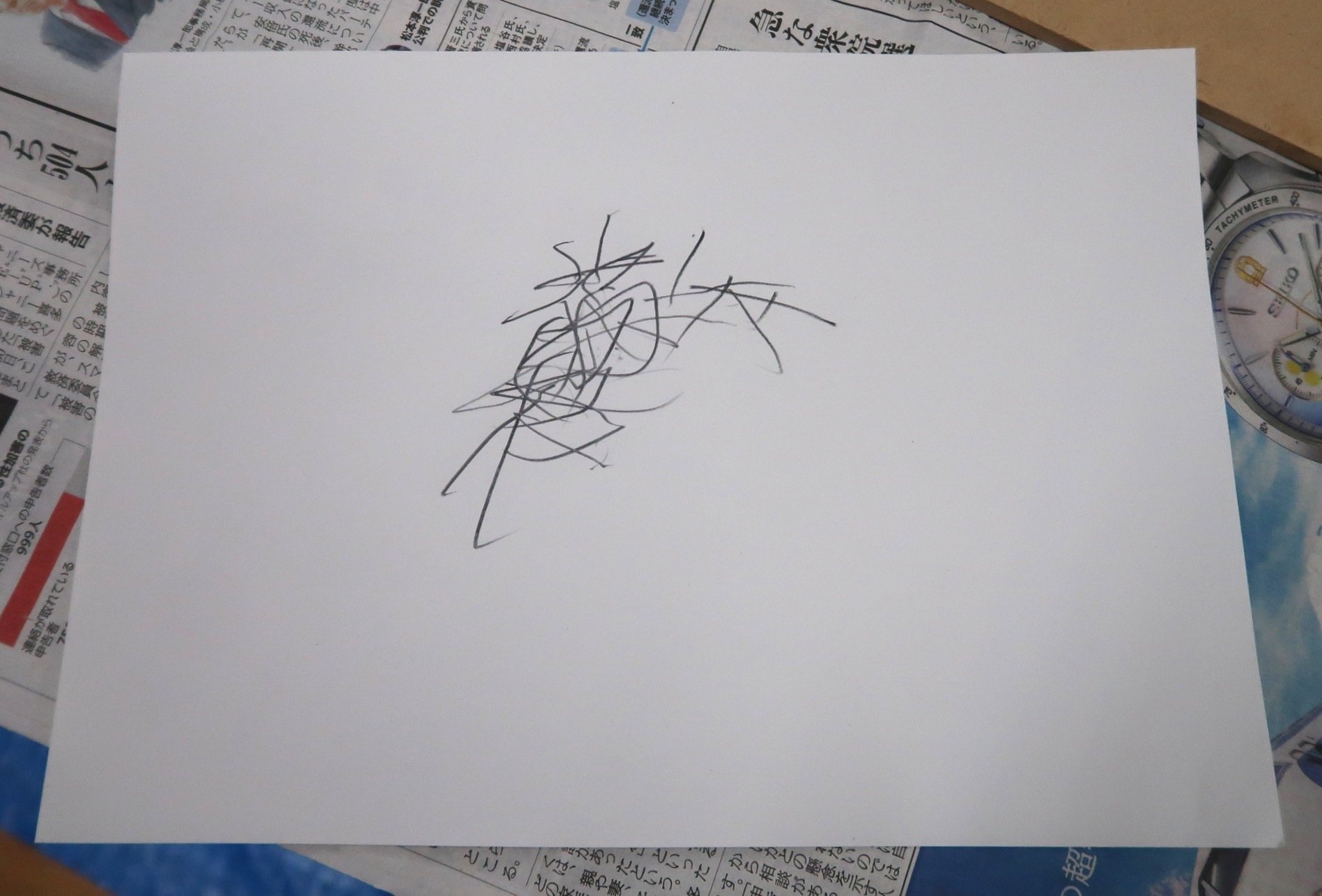 1つ目の今年を表す文字を書くワークでは、たくさんの線が重なったものや何となく読めそうなものなど、様々な文字が出来上がりました。