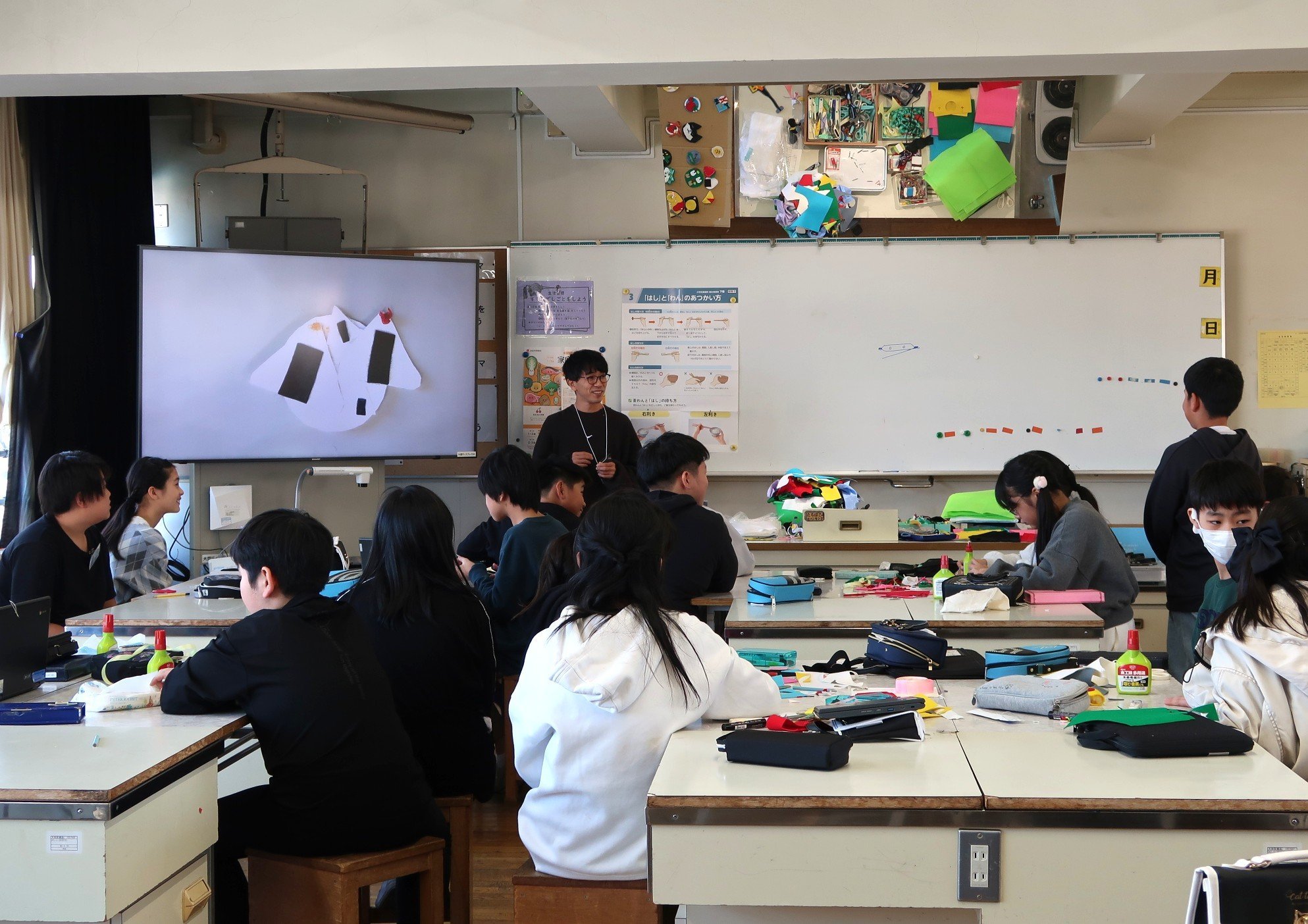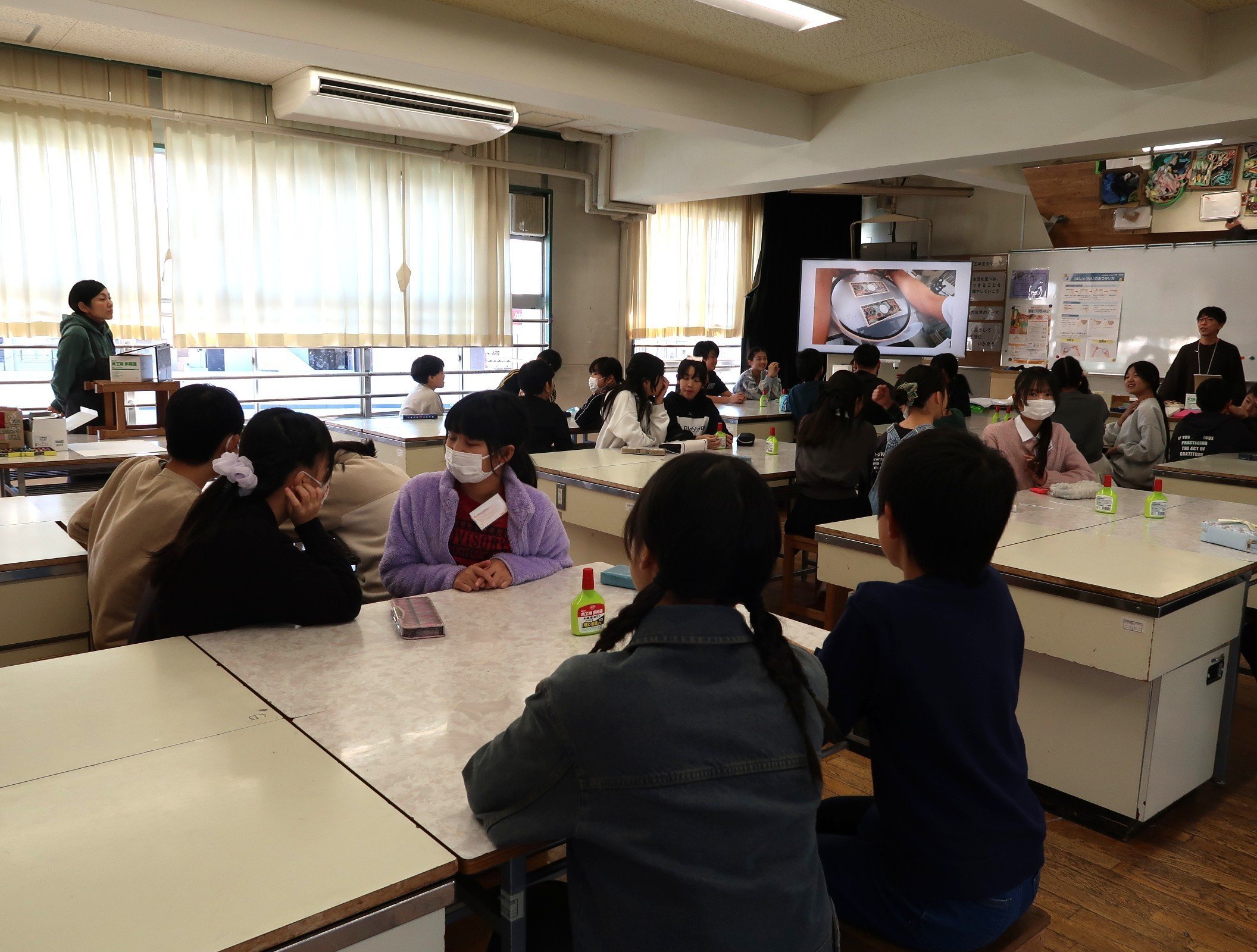 この学校では、単学級の6年生を対象に実施しました。授業テーマは「友達に贈るバッジを作る」。青山さんの作品鑑賞後に、学校生活をともに送ってきた友達へ贈るバッジを作りました。