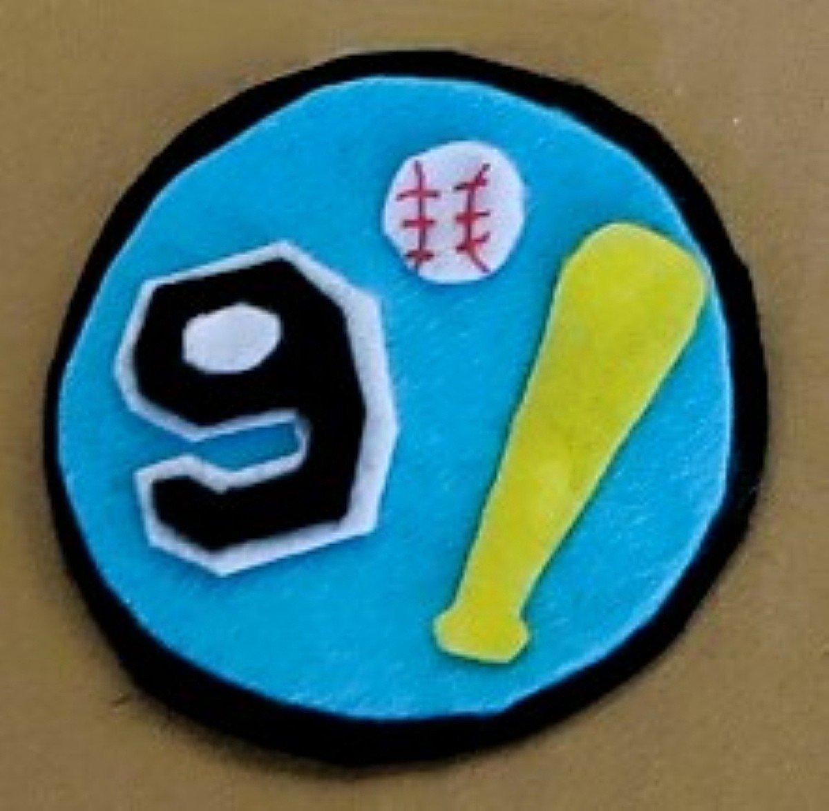 野球が趣味の子のためにバットとボール、その子の背番号が入ったバッジ
