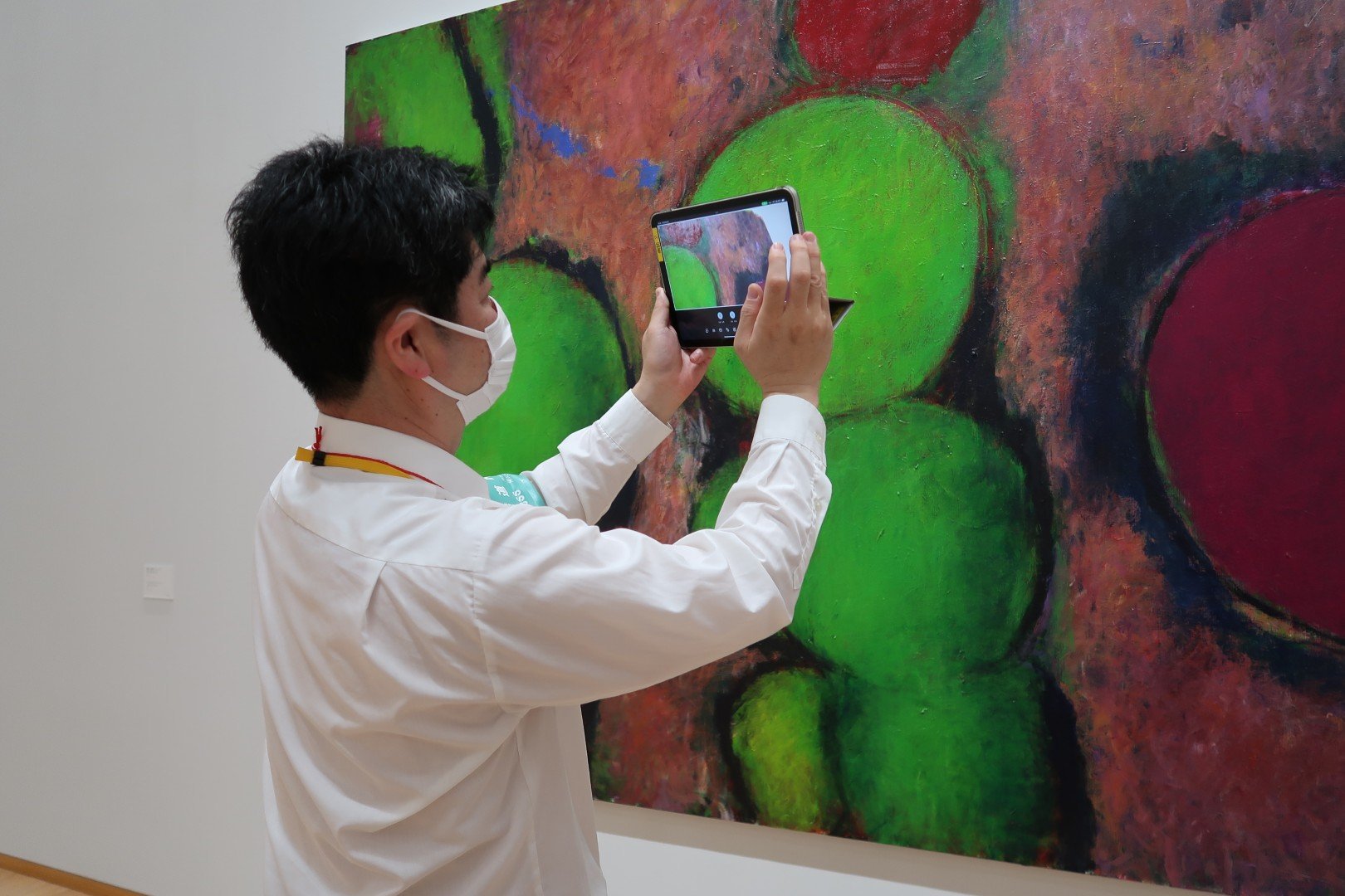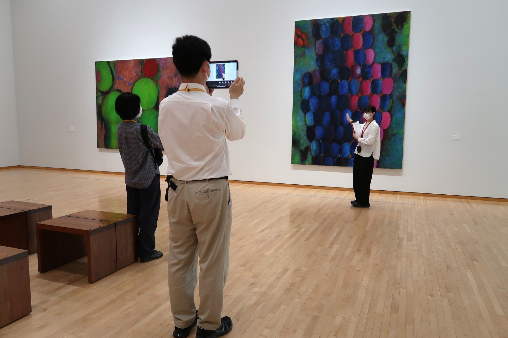 作品とその前に立つ美術館スタッフを遠くからカメラで映すと、作品の大きさがよくわかります。大きさ以外にも、描かれている様々な形や色合いなどがよくみえてきました。例えば、画面に描かれている色鮮やかな楕円形がブドウの粒にみえたり、あたたかい色味の作品をみて、太陽のようにみえたり、中にはオレンジジュースの中にいるようだとチャット機能を使って教えてくれる生徒さんもいました。