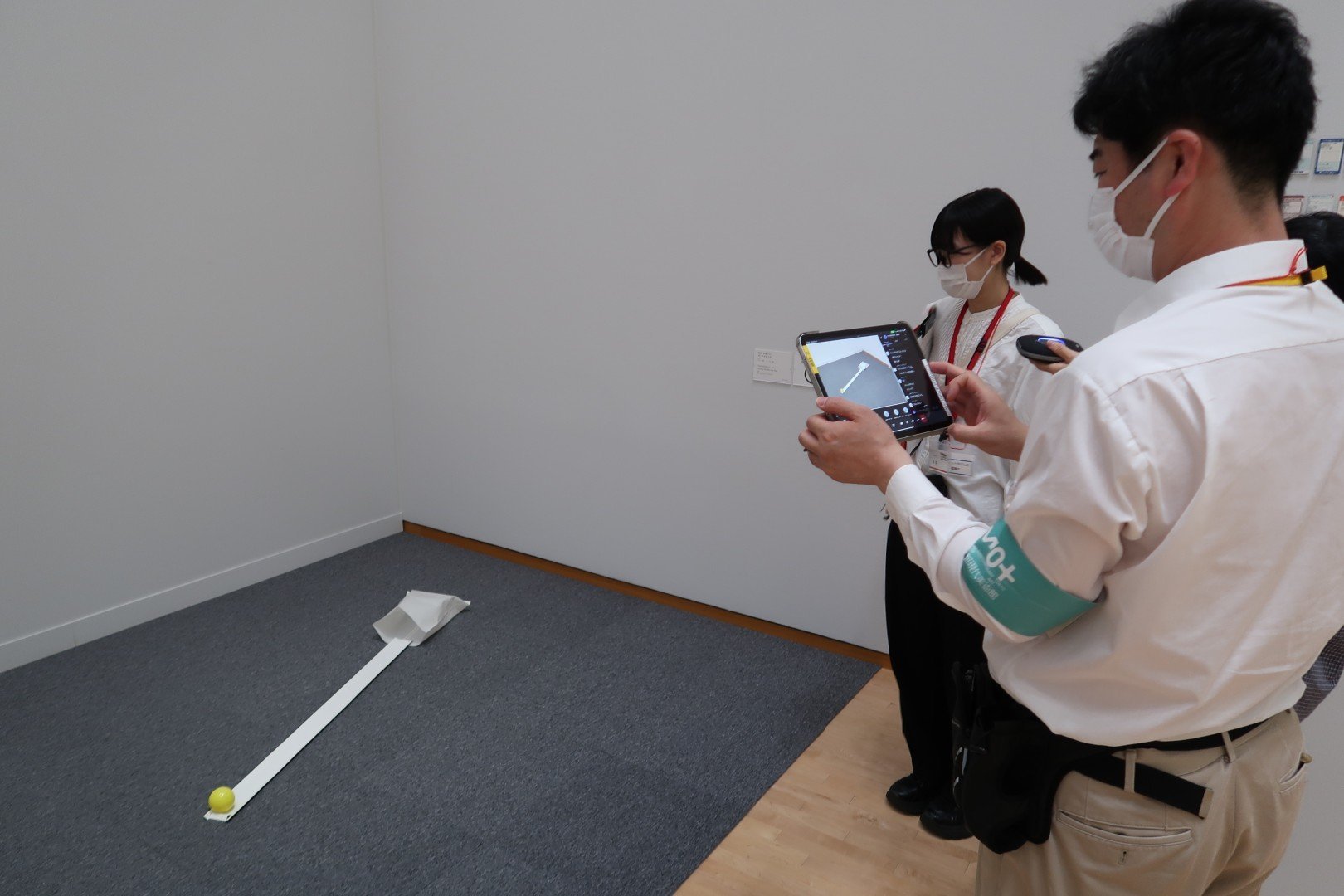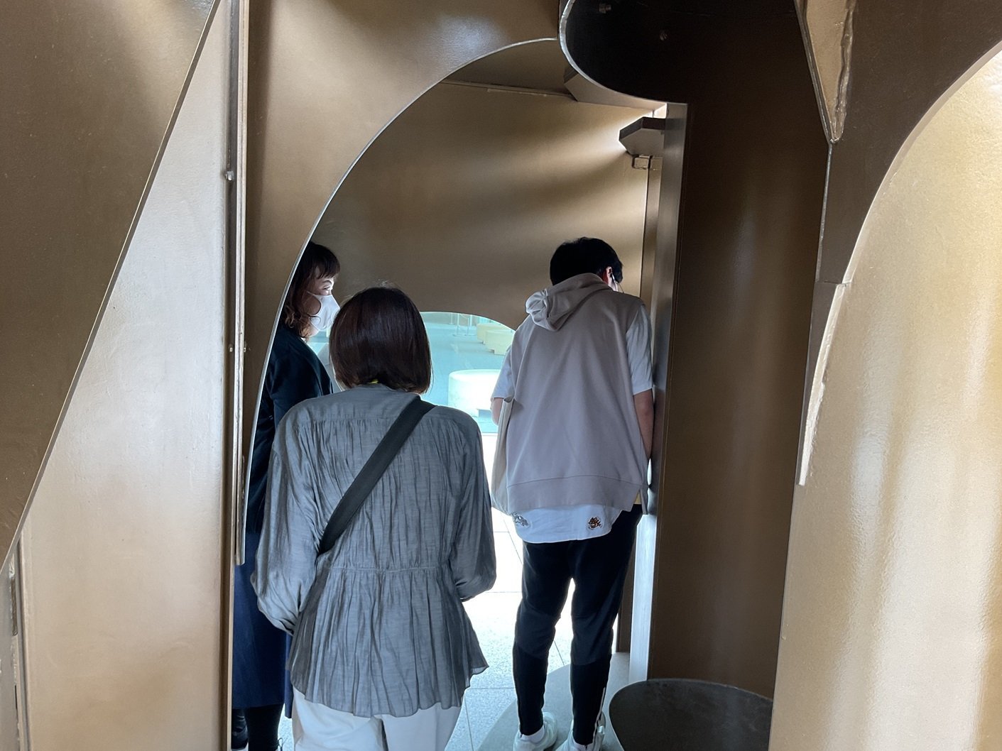 メガホンの形状になった鋼のパーツが見て取れます。「ここから小さな声で話しても下にいる人に聞こえるんですよ」とお伝えしたところ、下で待っている先生の名前を呼びかける生徒さん。どれくらい小さな声でも聞こえるかを試したところ、耳元で内緒話をささやくくらいの大きさでも先生に届き、びっくり!