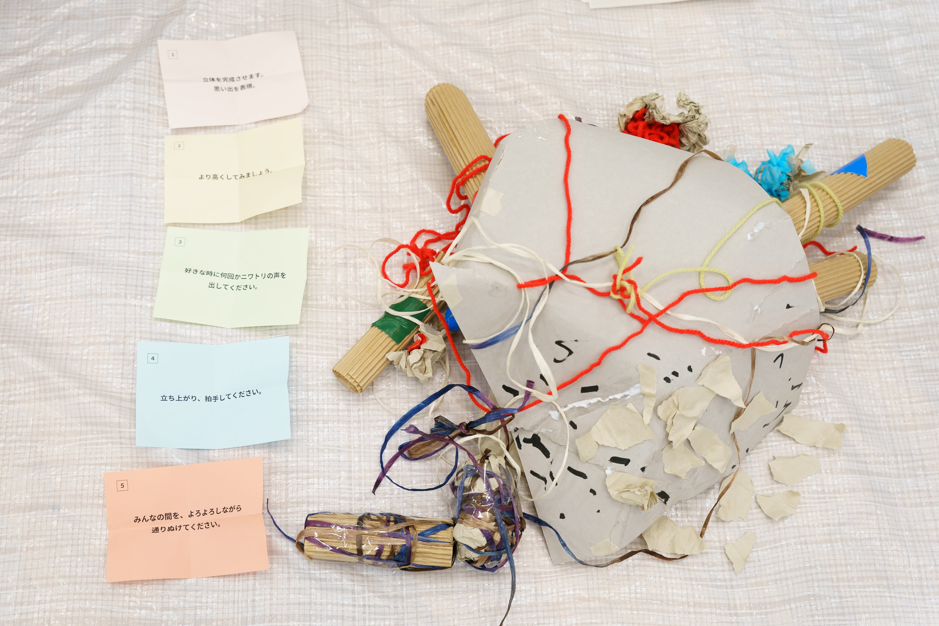 参加者はミッションのくじを何度か引き、そのたびに変化していく制作の方向性に翻弄されながらも、工夫を凝らして表現を続けていきます。くじには「◯◯色の素材を使う」「風景について描いてください」などといった制作に関わるものから、「作りかけの作品を3人に見せて、自慢げにうなずいてください」「大きな声で、がんばれーと言ってください」といった身体やコミュニケーションを介したものまで、多岐にわたるミッションが記されていました。
