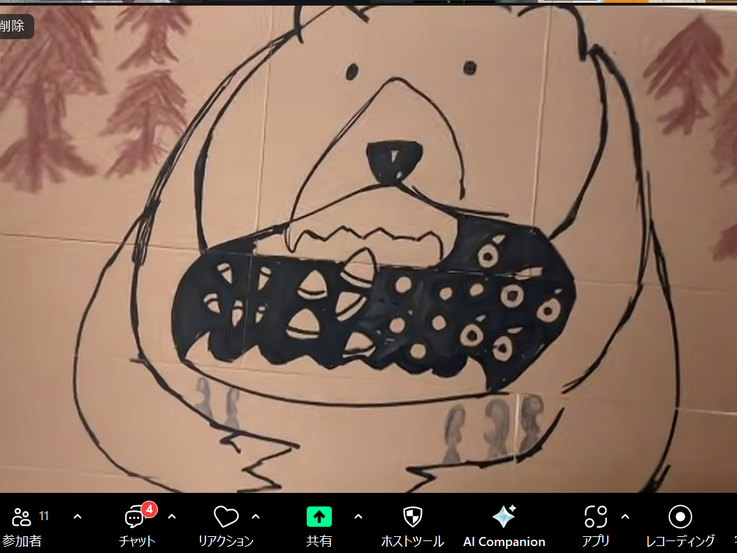 こちらは「大地」から「クマ」を連想し、ボードいっぱいにクマを描いた作品です。さらに、クマから木の実も連想したので、木の実も描いたと教えてくれました。