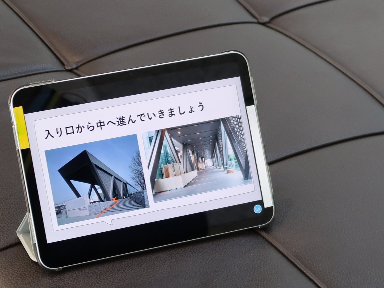 今回の授業は、小学2年生から中学1年生までの4名が参加してくれました。授業が始まり、作品が展示されているコレクション展示室に向かうため、さっそく館内を進んでいきます。その際、実際に美術館に遊びに来ているような感覚を味わってもらえるように、展示室までの道のりをスライドを使って簡単にご紹介しました。その中で「エントランスから続く長い廊下はどのくらいの長さでしょうか?」「館内にあるレストランで食べられるのはどっち?」などのクイズが美術館スタッフから出題され、子どもたちは、事前に用意されたA/Bカードを各々のカメラに映して答えてくれました。