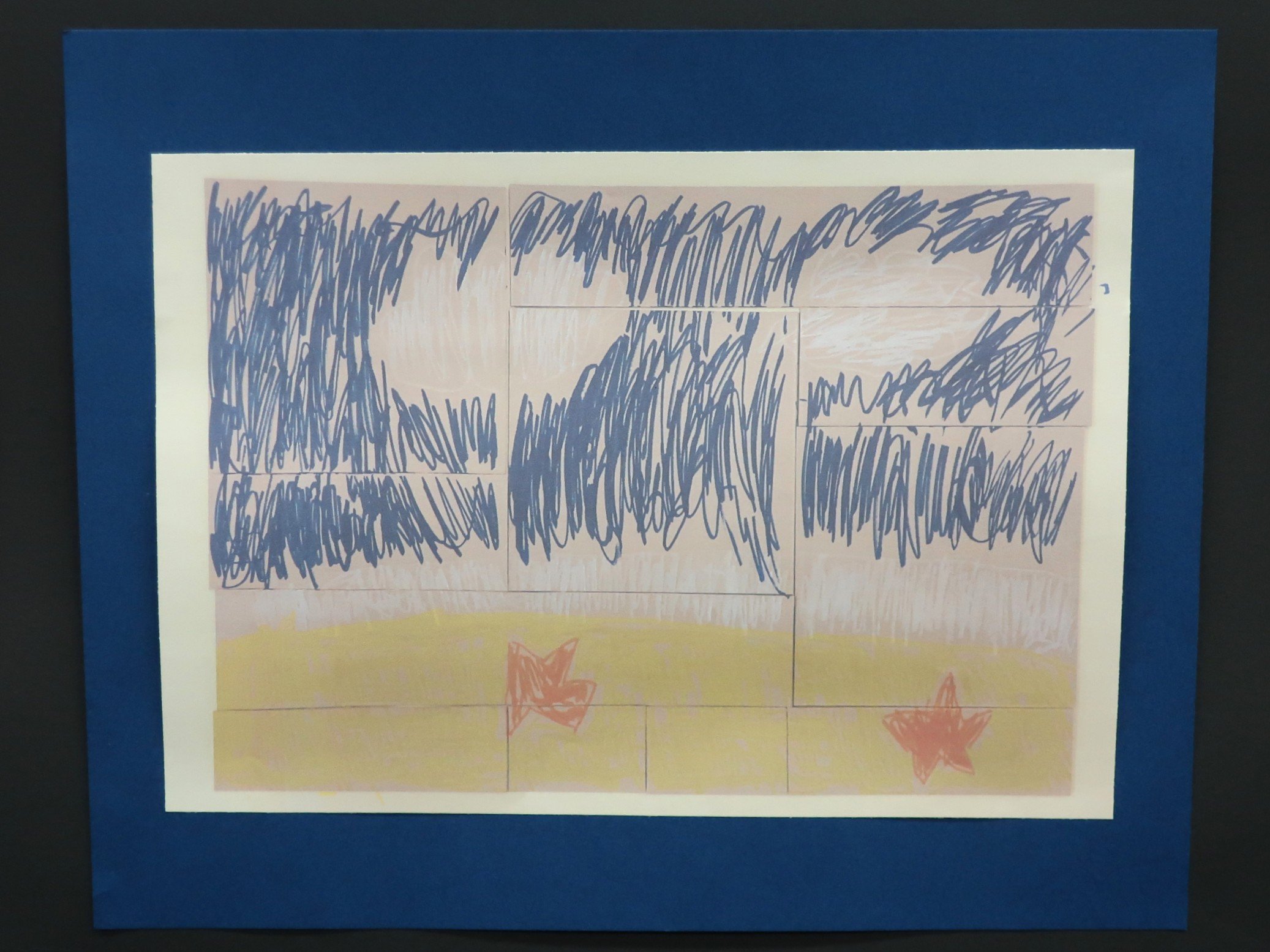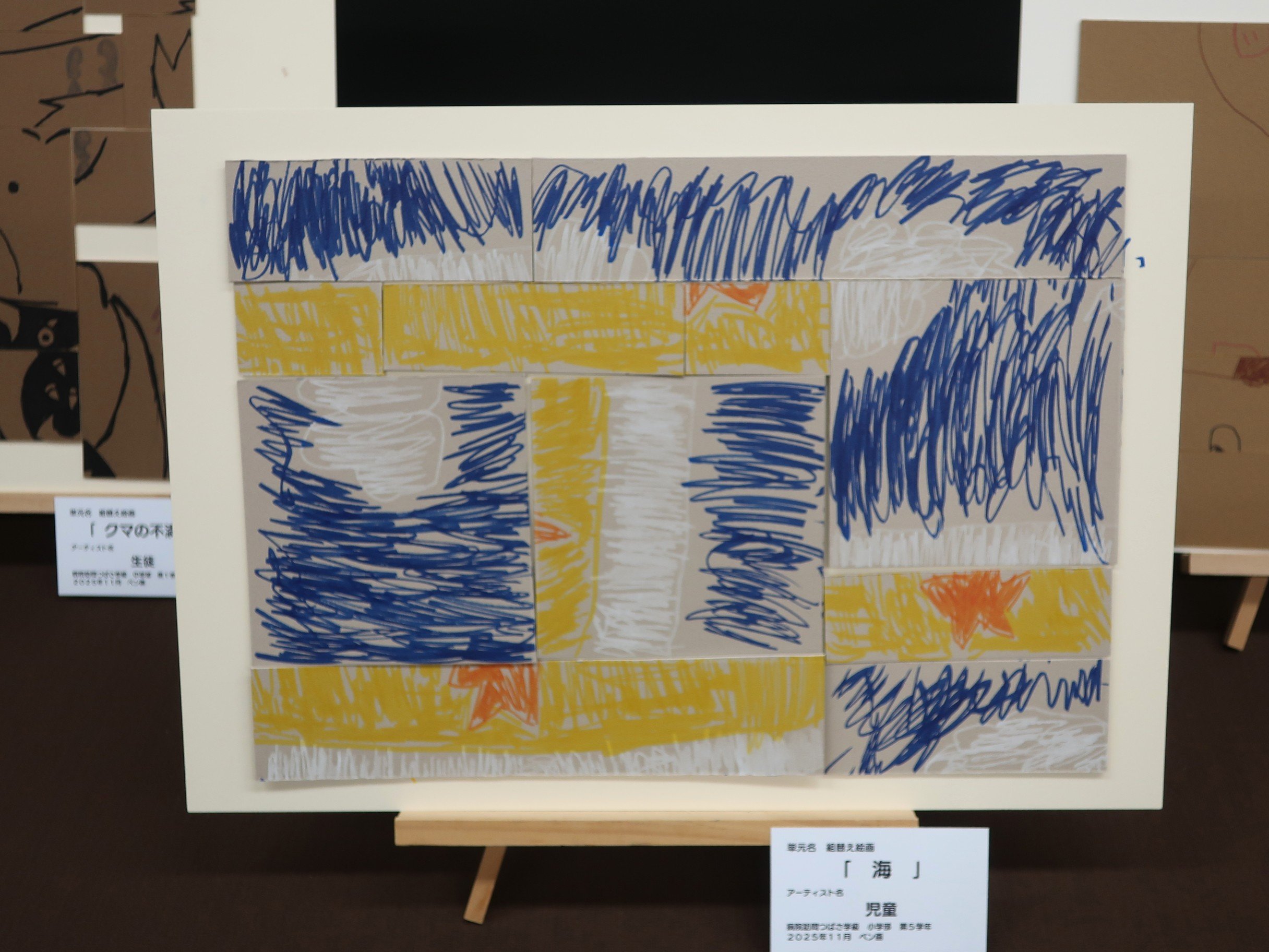こちらは《海》と題された作品。青い海と、ヒトデがいる黄色い砂浜でしょうか。画面いっぱいに色が塗ってあり、見ごたえ抜群!組み替えた後は「エー」と書いてあるようにも見えてきました。