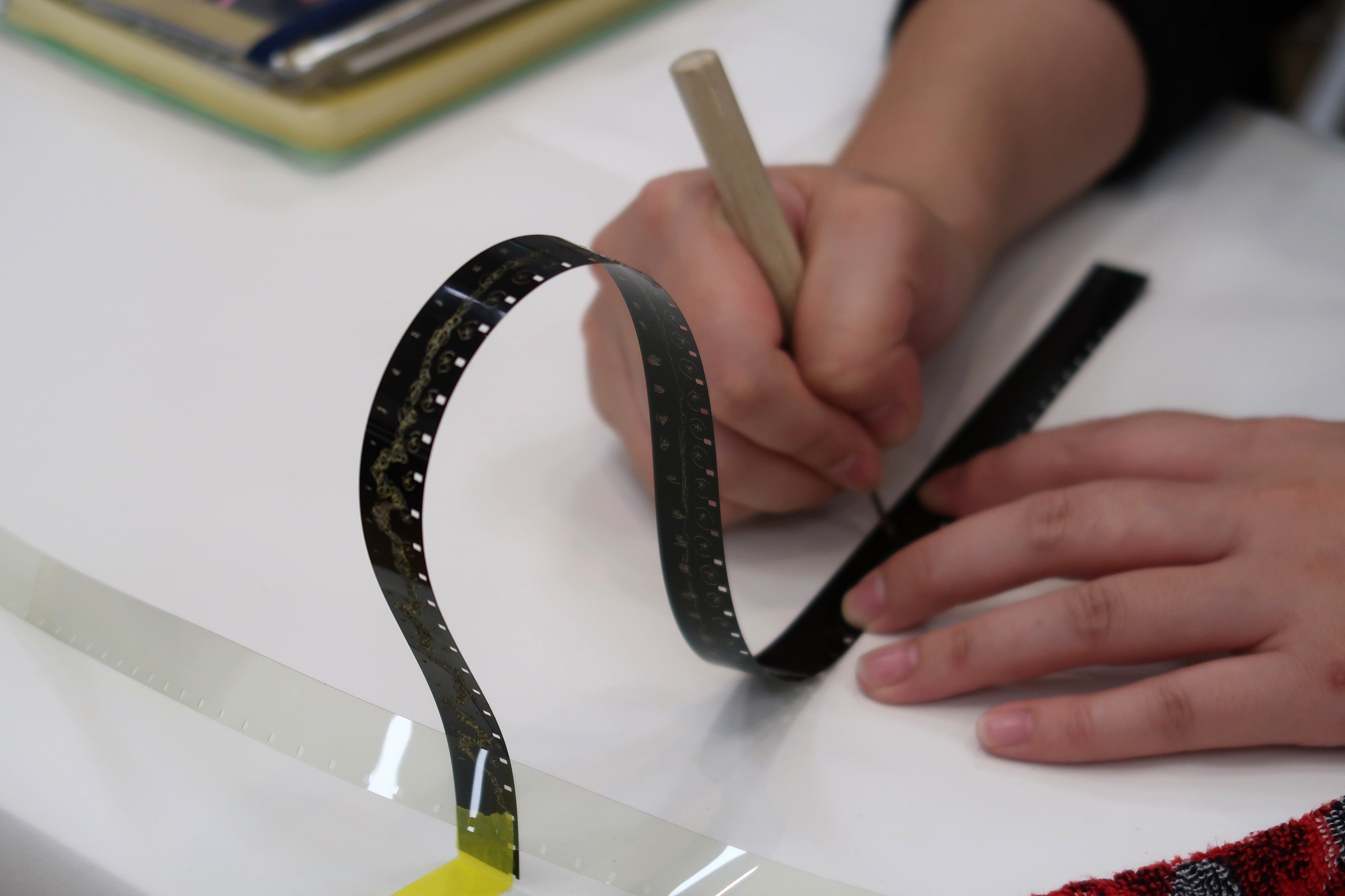 制作時間には、参加者それぞれにフィルム片が配布され、思い思いの線や形が描き込まれていきました。黒味のフィルムを削って光を生み出す感触や、透明なフィルムに色を重ねていく体験は、普段の紙への描画とはまったく異なるものです。参加者は、フィルムという素材ならではの特性を楽しみながら、集中した表情で制作に取り組んでいました。