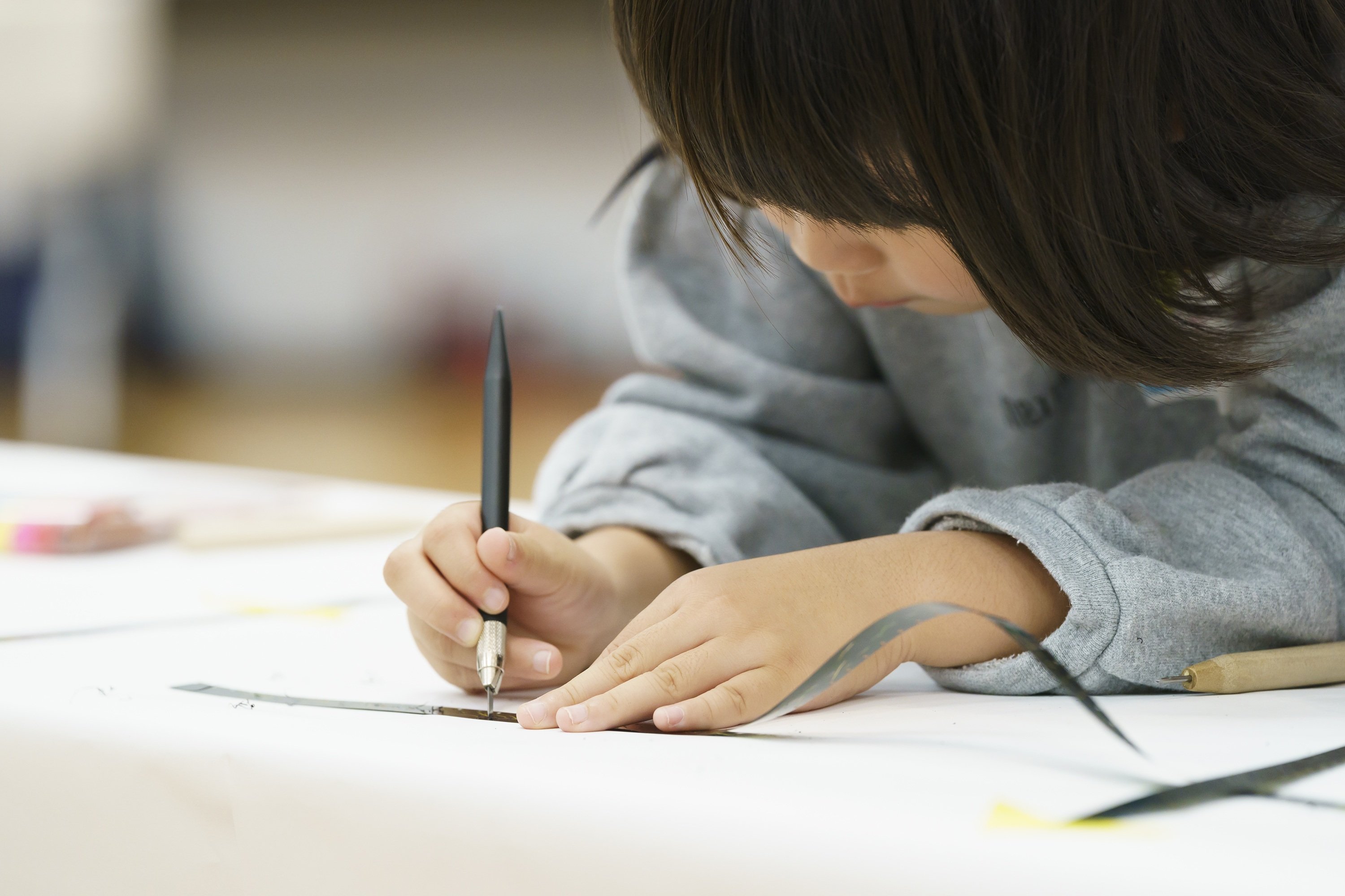 本ワークショップは、16mmフィルムという、映像の歴史の原点ともいえる素材を実際に手に取り、「映像がどのように生まれるのか」を体験するプログラムです。黒味(不透明)や素抜け(透明)のフィルムに、ニードルで削って傷をつけたり油性マジックで描いたりと、フィルムそのものに直接手を加えながら表現を行いました。描き方にルールはなく、年齢や経験を問わず、誰もが自由に取り組める内容となりました。