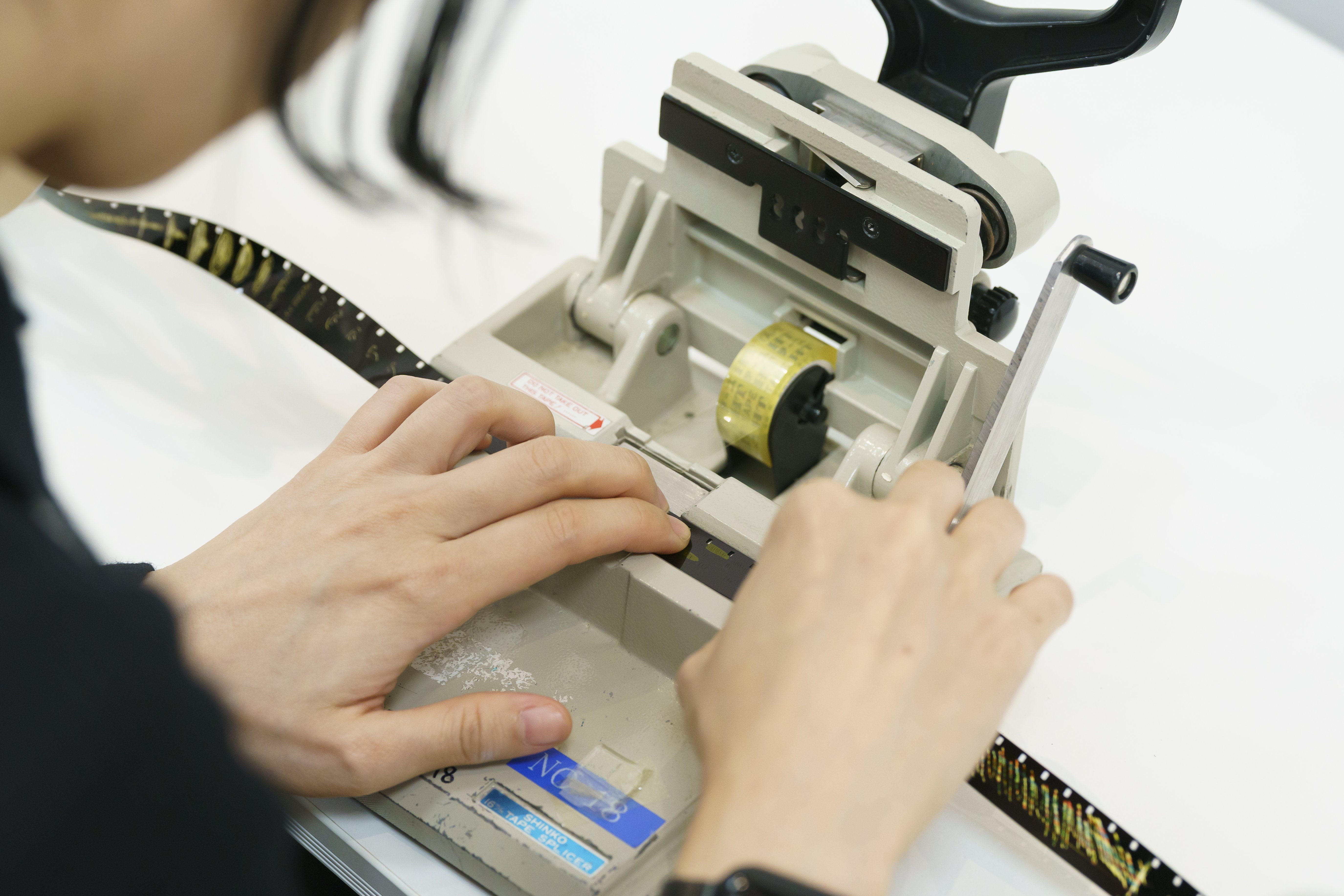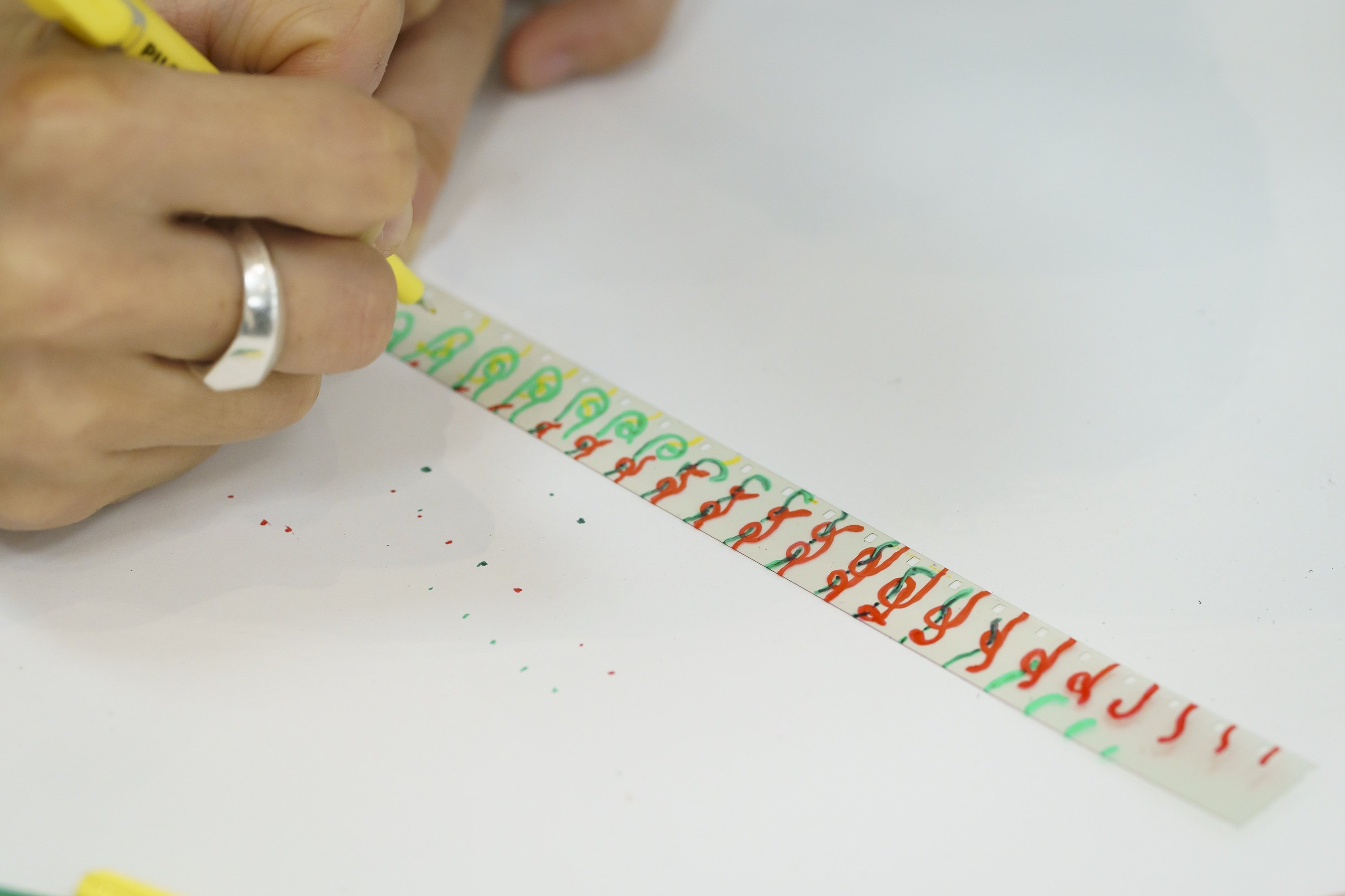 描き終えたフィルムは順番につなぎ合わされ、一本の長いフィルムへと変化していきます。個々に制作された線や模様が連なり、どのような動きとして現れるのかは、上映してみるまで分かりません。