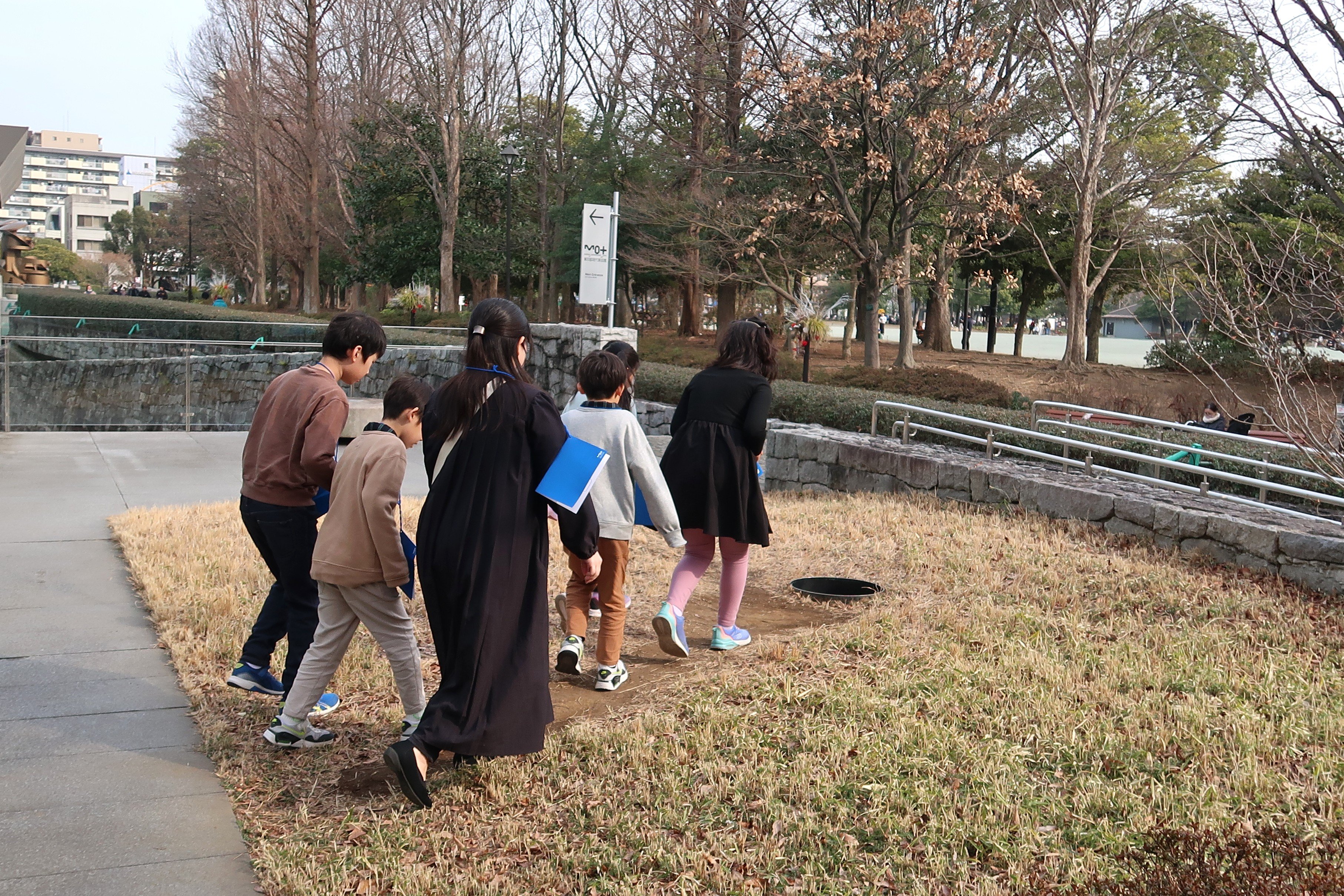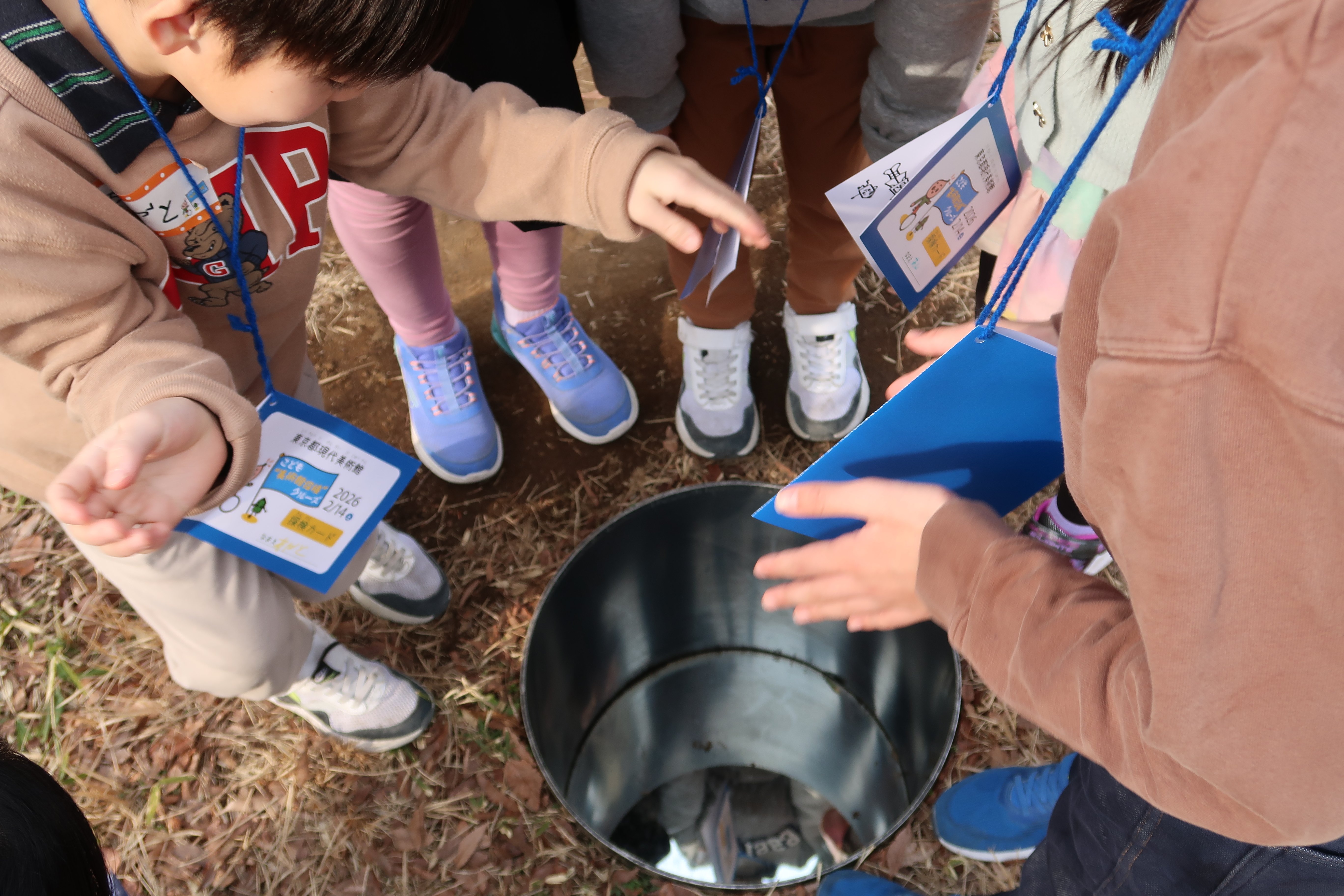 こちらは、「外にも作品がある!」と教えてくれた子がチームのみんなを作品の前まで案内してくれた様子です。到着した場所は何もないように見えますが、よく見ると地面に穴が空いています。その穴の中には鏡が設置されていました。子どもたちは穴を覗き込み、鏡に映る自分たちの顔を楽しそうに眺めていました。また、鑑賞中に「天気が変わったら鏡に映る空の色も変わるかもしれない」と実際に目にしているものだけでなく、想像を膨らませながら作品を楽しんでいました。