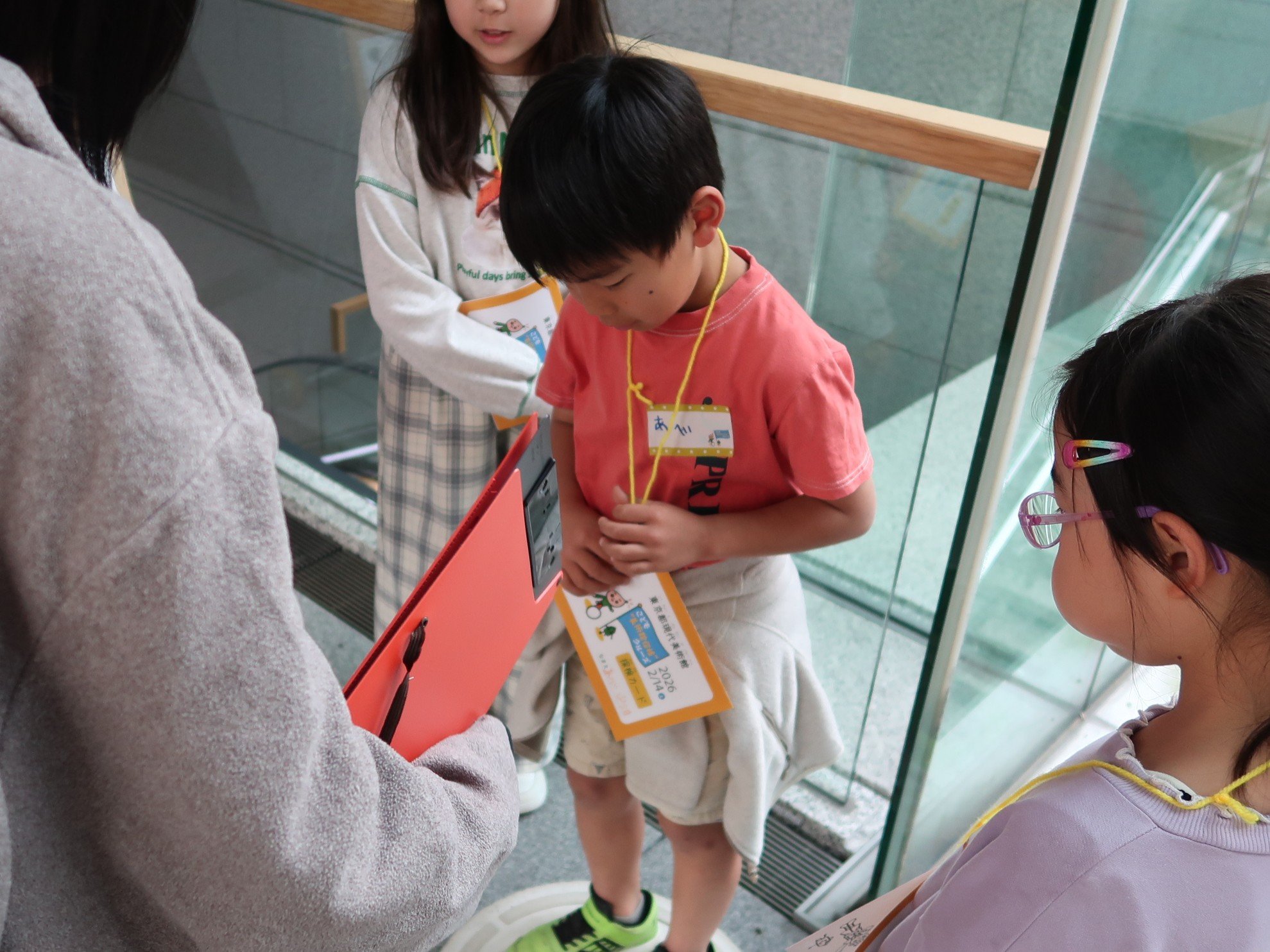 子どもたちは探検に向かう前に3チームに分かれ、チーム内で簡単な自己紹介が行われました。各チームには美術館スタッフがリーダーとして付き添い、チームごとに異なるルートで探検します。出発前にリーダーからキーワードを埋めるための5つのマスが並んだ「探検カード」が手渡されました。キーワードは探検中に、子どもたちが自分の目線で美術館の面白さを発見したり、普段立ち入ることのできない美術館の裏側で特別な体験をするともらうことができます。「どんなキーワードが完成するのかな?」「美術館の裏側には何があるのかな?」と胸を躍らせながら、いざ出発!