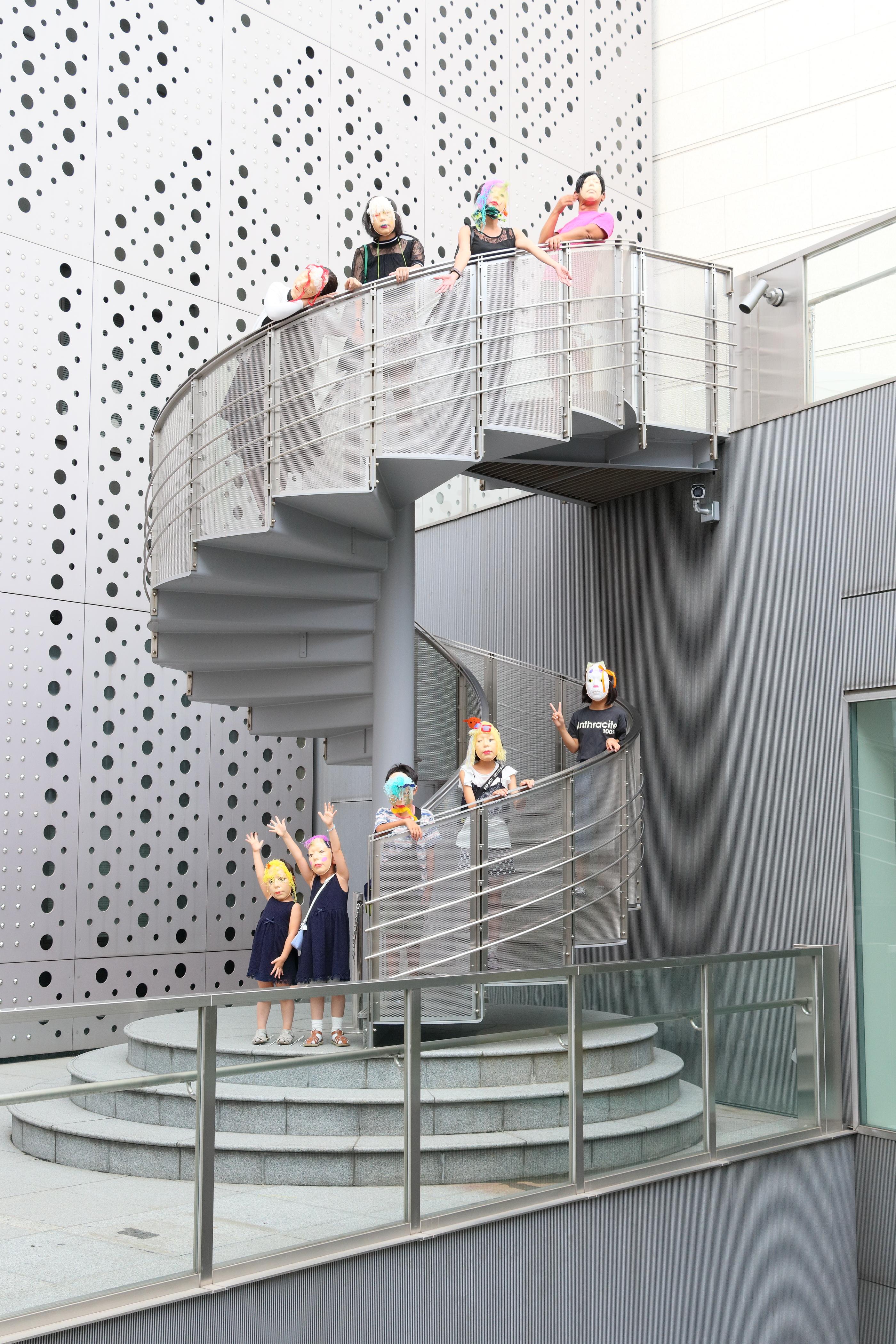 後ろにお面をかぶりながら「水と石のプロムナード」を歩いて、地下1階へ。美術図書室やレストラン「100本のスプーン」を外から見ながら、また1階に上がり壁にかこまれた中庭へと到着しました。日よけの機能を持つパンチングメタルの穴が特徴的な空間です。高低差を生かした螺旋階段に散らばって、はいポーズ!