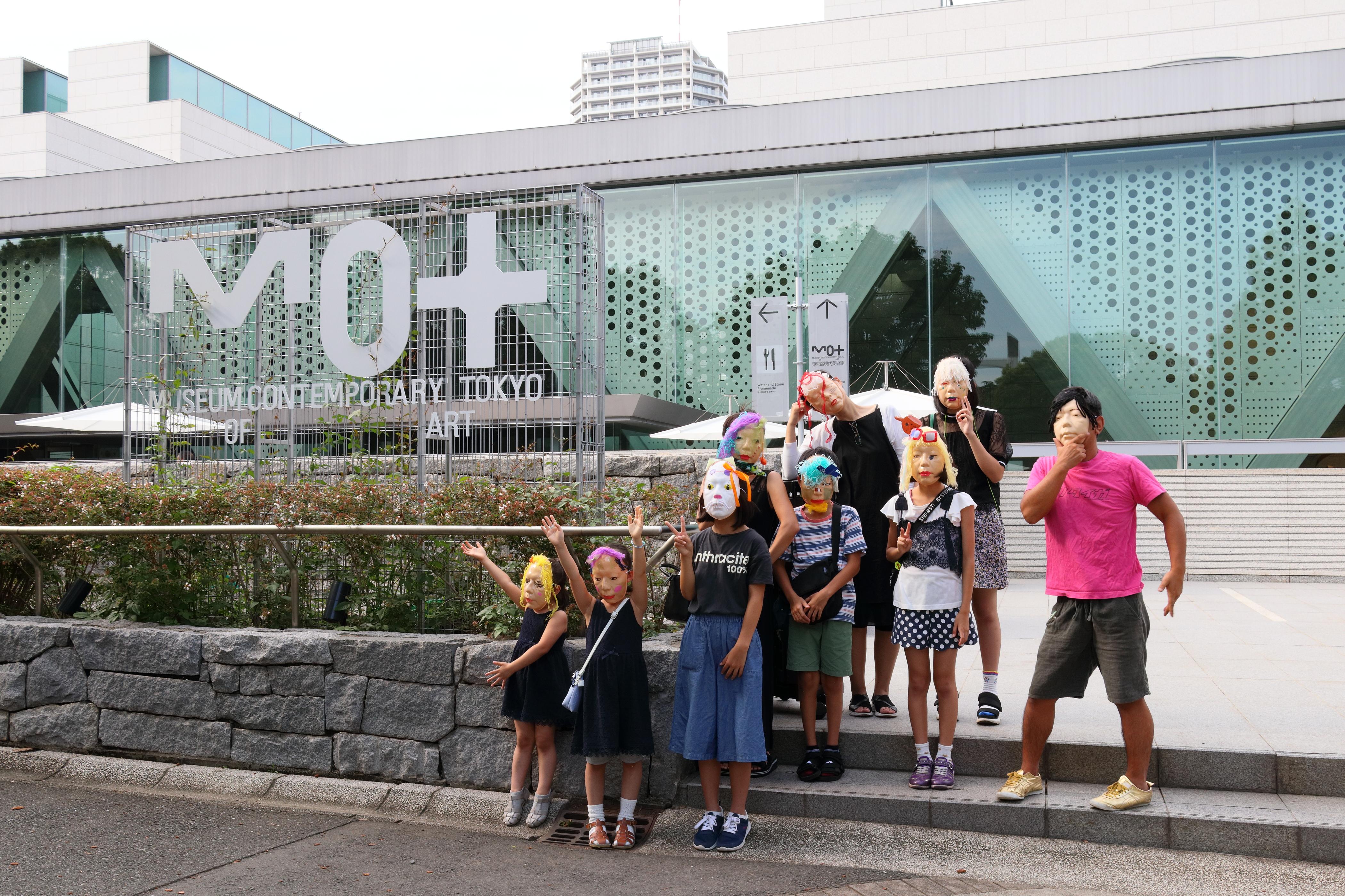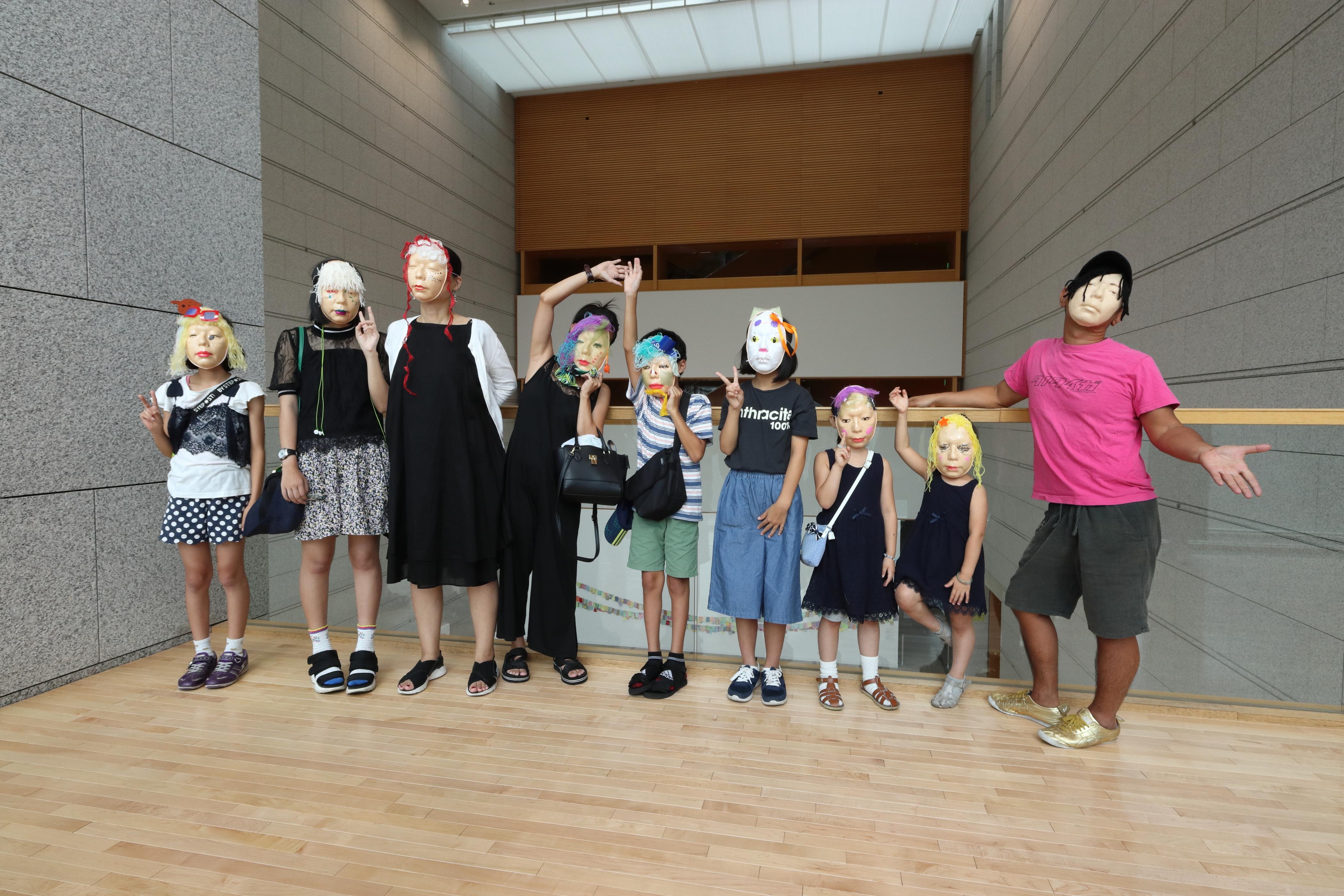 こちらが最後の撮影スポット。今までの撮影スポットとは違い、トラックが出入りする大きな荷解き場で広がってポーズを取ります。まるでアルバムのジャケット撮影のよう!帰りは館内空調の整備などを担当するスタッフの案内のもと作品用の巨大エレベーターに乗り込み1階展示室に戻ります。お別れに特別なバッグで自作のお面を持ち帰り、1時間のイベントが無事終了しました。