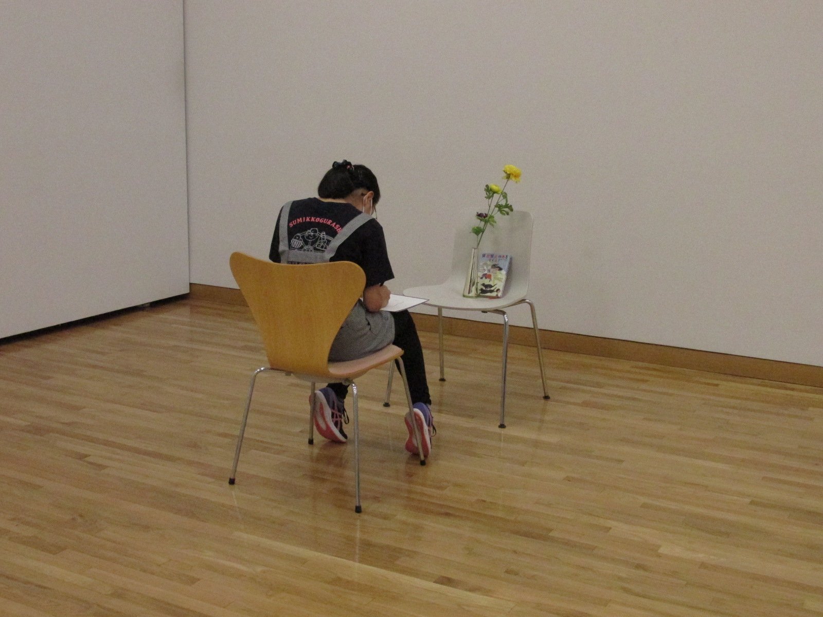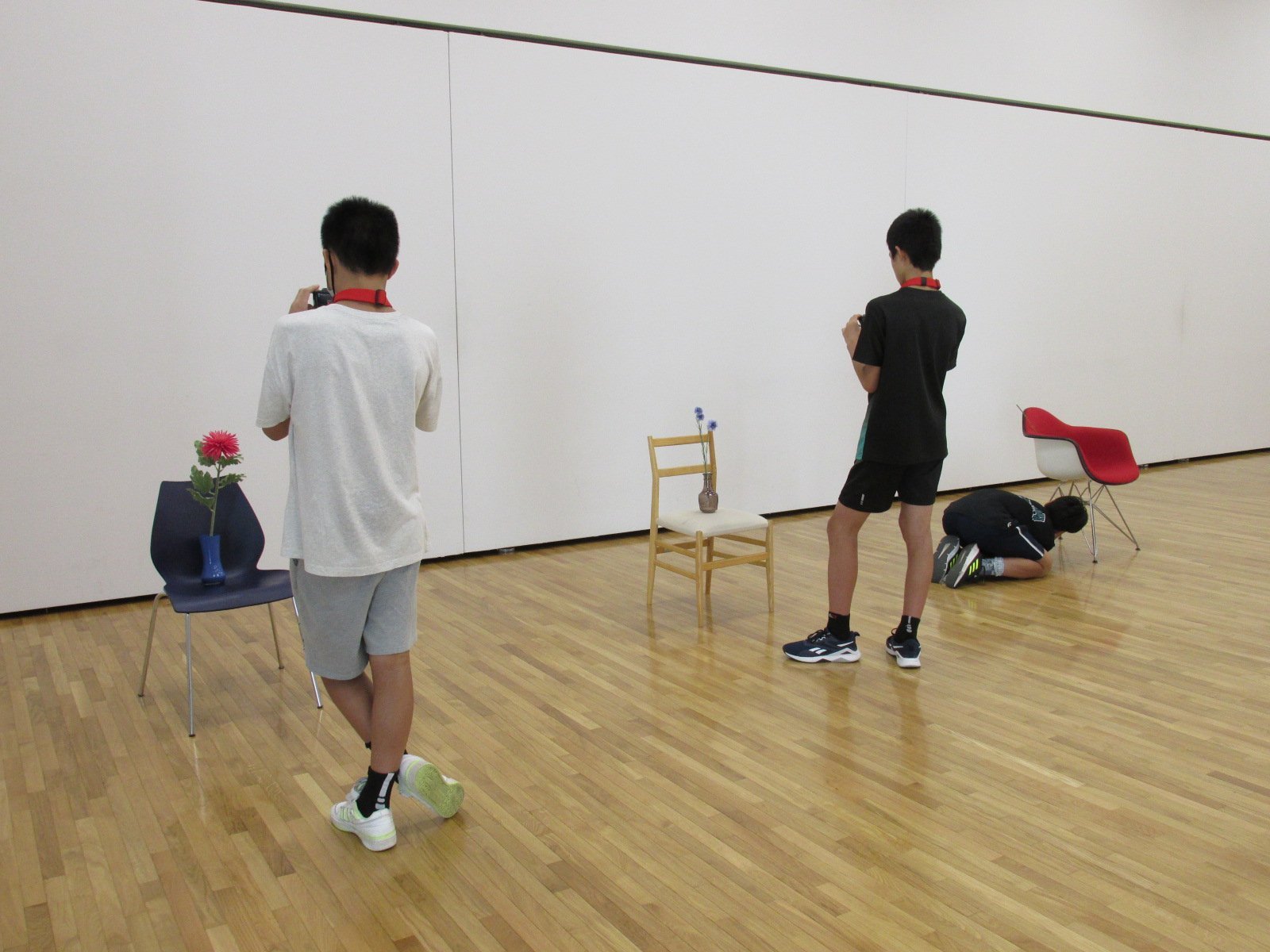 椅子と花瓶と花、そして参加者自身が持ってきたものを組み合わせ、モチーフを組みあげます。