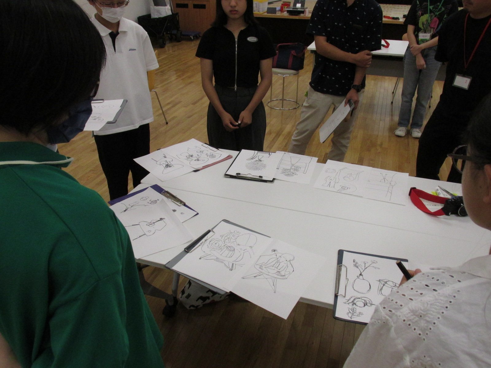 こうして組みあげたモチーフをまずは、準備運動も兼ねてクロッキー(速写)しました。1回目はモチーフの正面に座り、見える景色をそのまま描く。2回目はモチーフのまわりを歩き回り、「多視点」を意識し、椅子の脚や座面、モチーフの一部など、なるべく多くの部分を描いてもらいました。このクロッキーを通じて、「凝視(じっくり見ること)」と「一瞥(ちらっと見ること)」という往還を体験していただけたのではないかと感じています。5分×2回の短い時間、参加者のみなさんがとても集中して取り組んでいた様子が印象的でした。