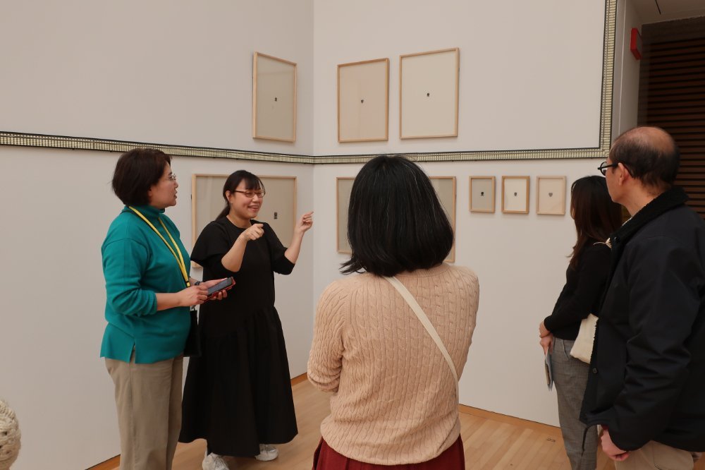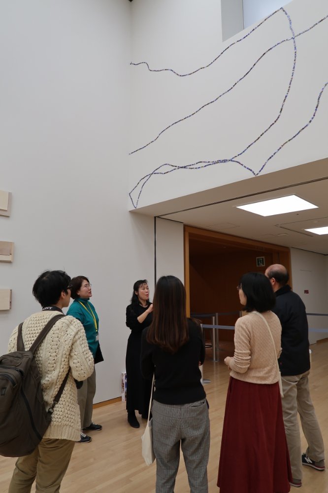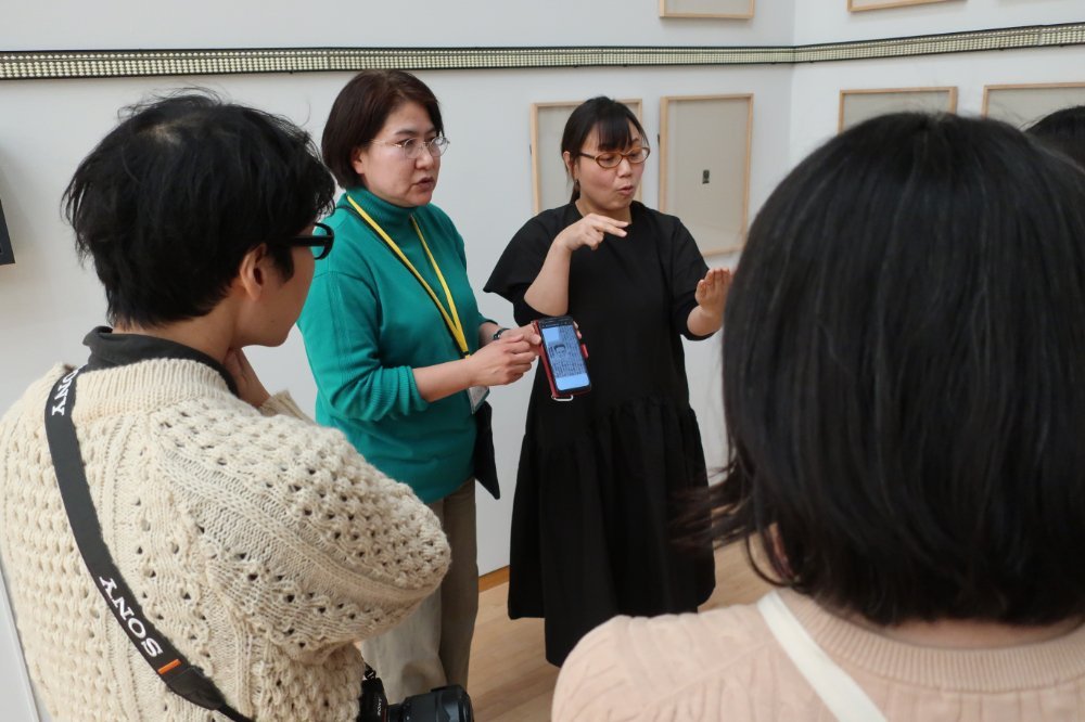 2024年1月27日(土)の閉館後、「豊嶋康子 発生法──天地左右の裏表」展の関連プログラムとして、手話通訳を介した鑑賞会が開催されました。本プログラムは、手話を主要なコミュニケーション手段とする方を対象とし、展覧会出品作家である豊嶋康子さんと展示室を巡り、参加者の皆さんと意見をかわしながら鑑賞するものです。今回は4名の方にご参加いただきました。