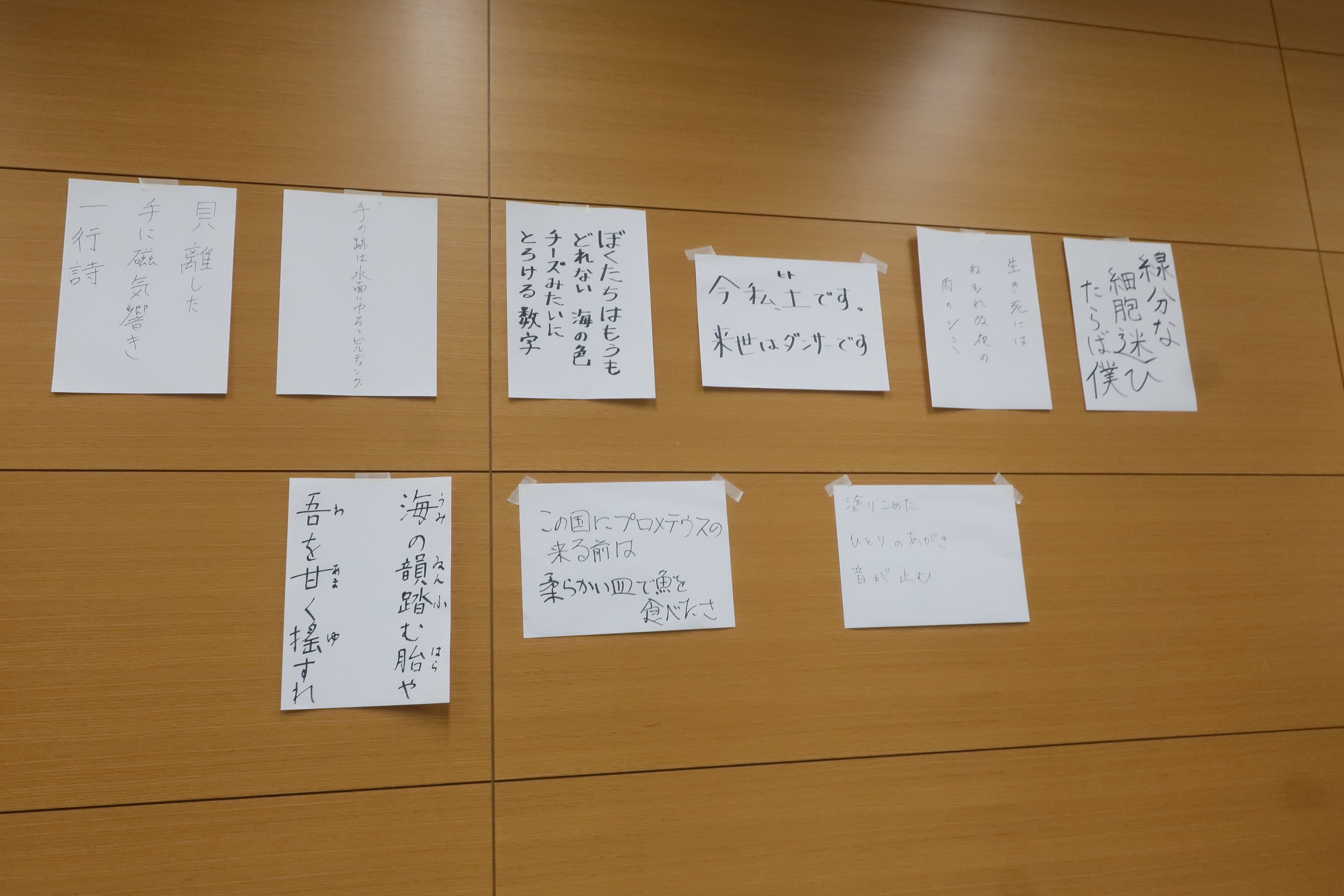 ふだんから詩を書き慣れているわけではない方々も、「言葉の組み合わせで考えを表現する」ことにスムーズに入りこめていて、講師としては大変やりやすい時間でした。