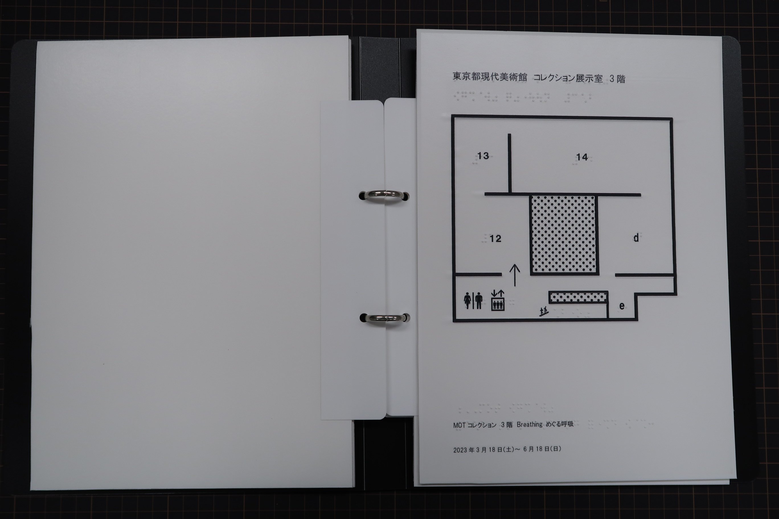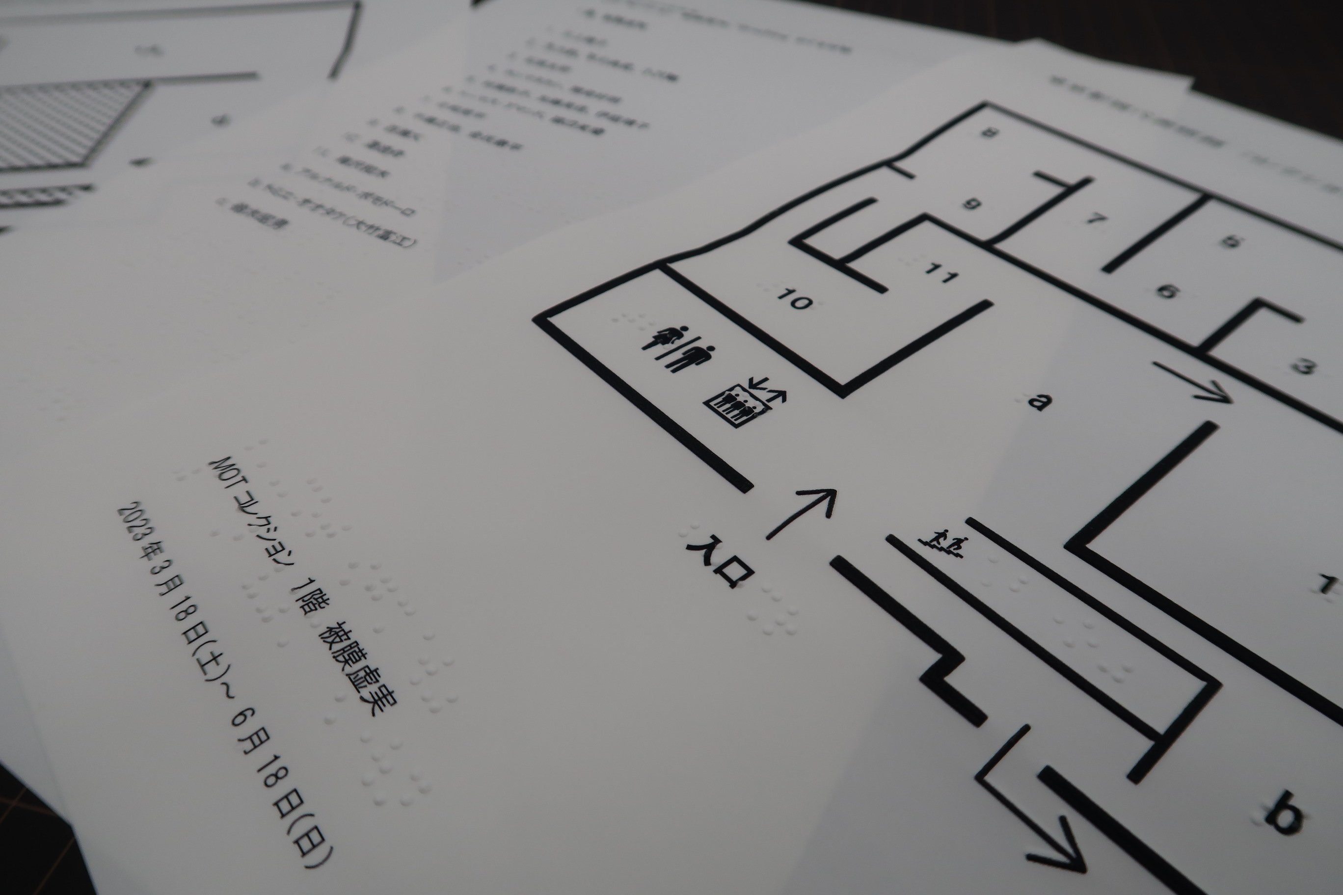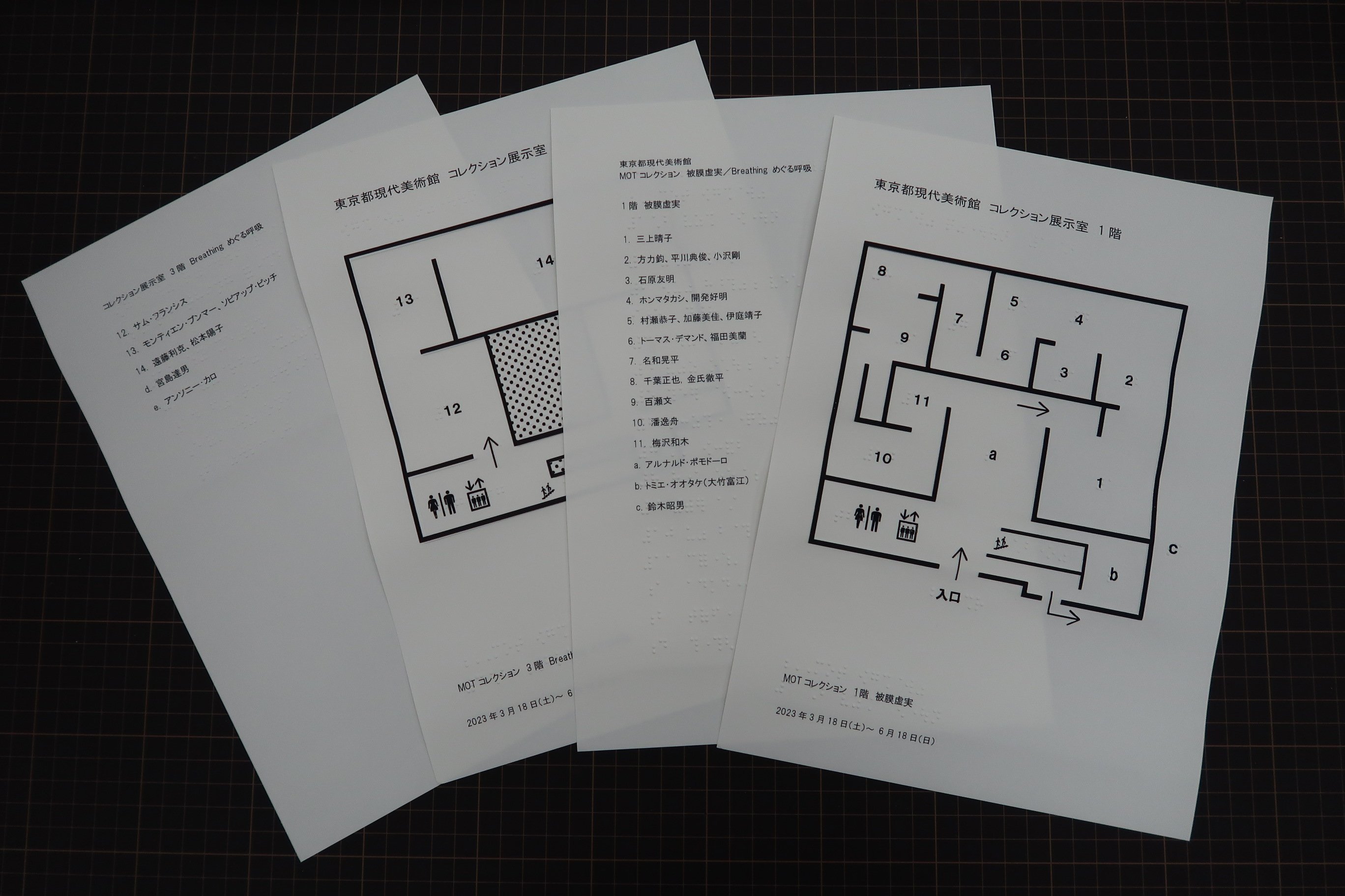 視覚障害のある方にご活用いただけるよう、開催中のコレクション展の触察フロアマップを作成しました。本マップでは、大まかな作品配置と作家名などが墨字と点字等で確認できます。