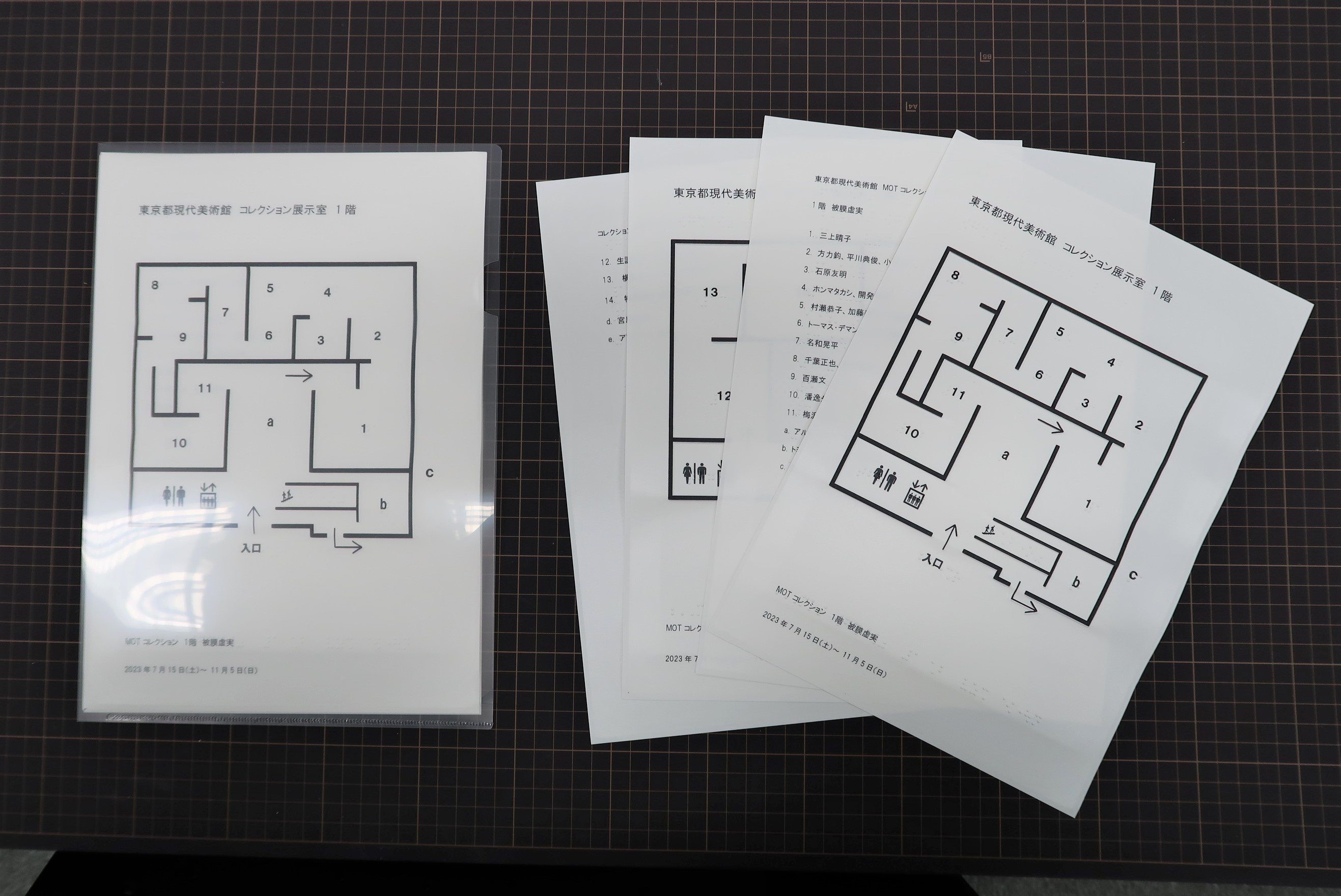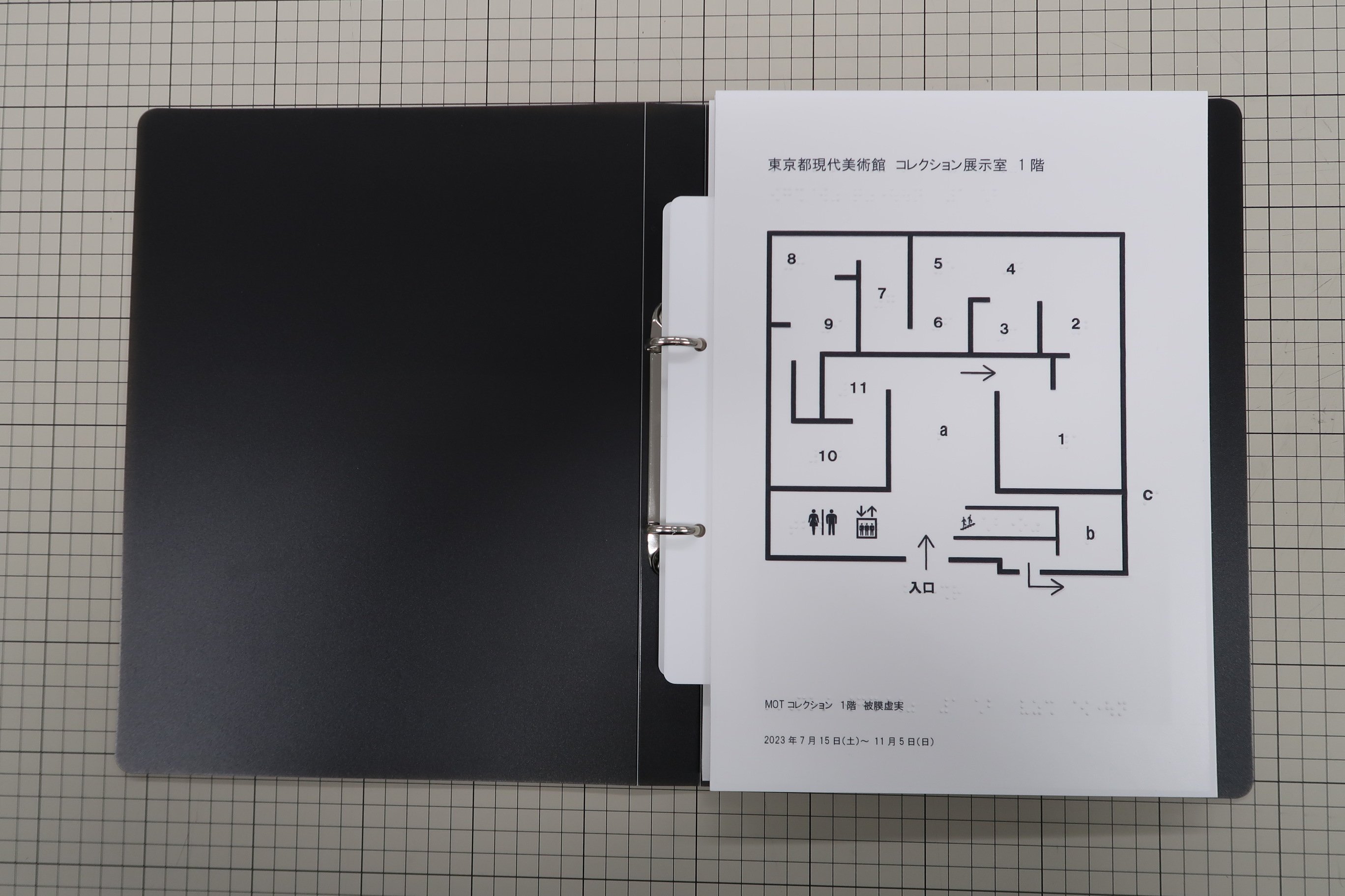 視覚障害のある方にご活用いただけるよう、開催中のコレクション展の触察フロアマップを作成しました。本マップでは、大まかな作品配置と作家名などが墨字と点字等で確認できます。