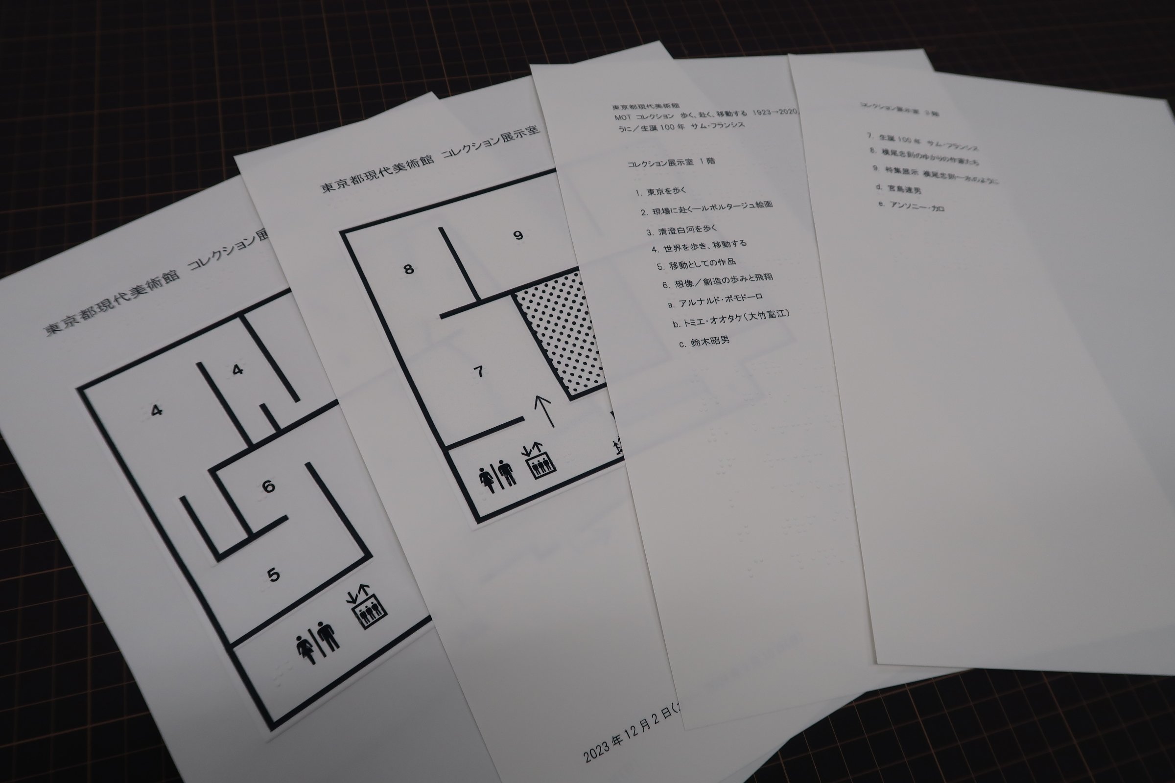 視覚障害のある方にご活用いただけるよう、開催中のコレクション展の触察フロアマップを作成しました。本マップでは、大まかな作品配置と作家名などが墨字と点字等で確認できます。
