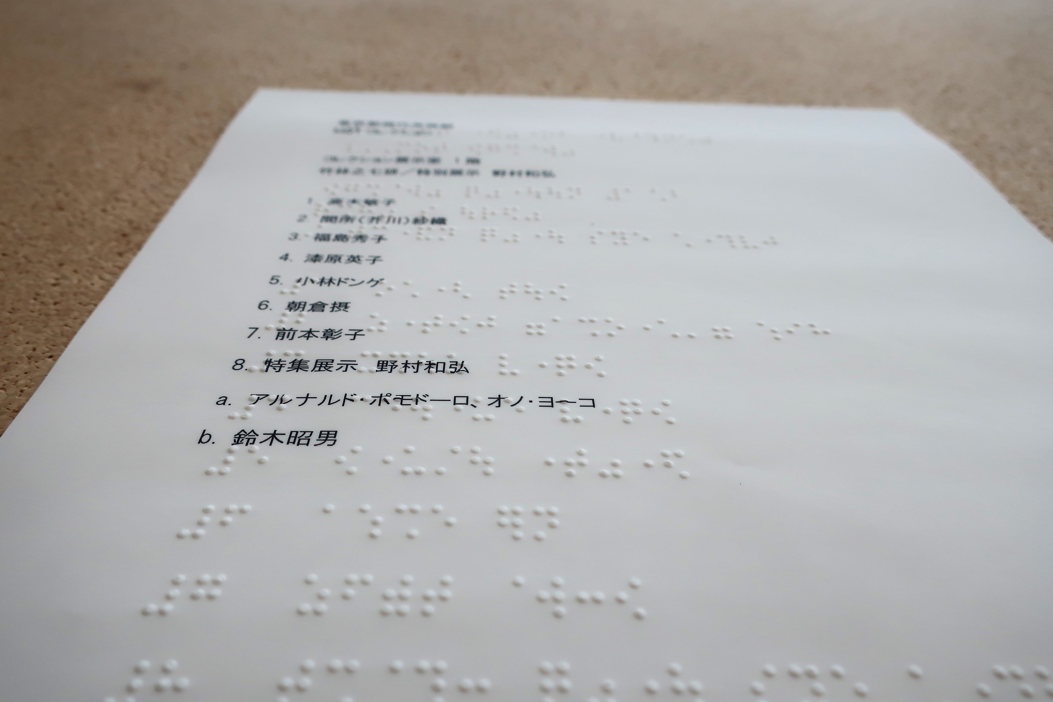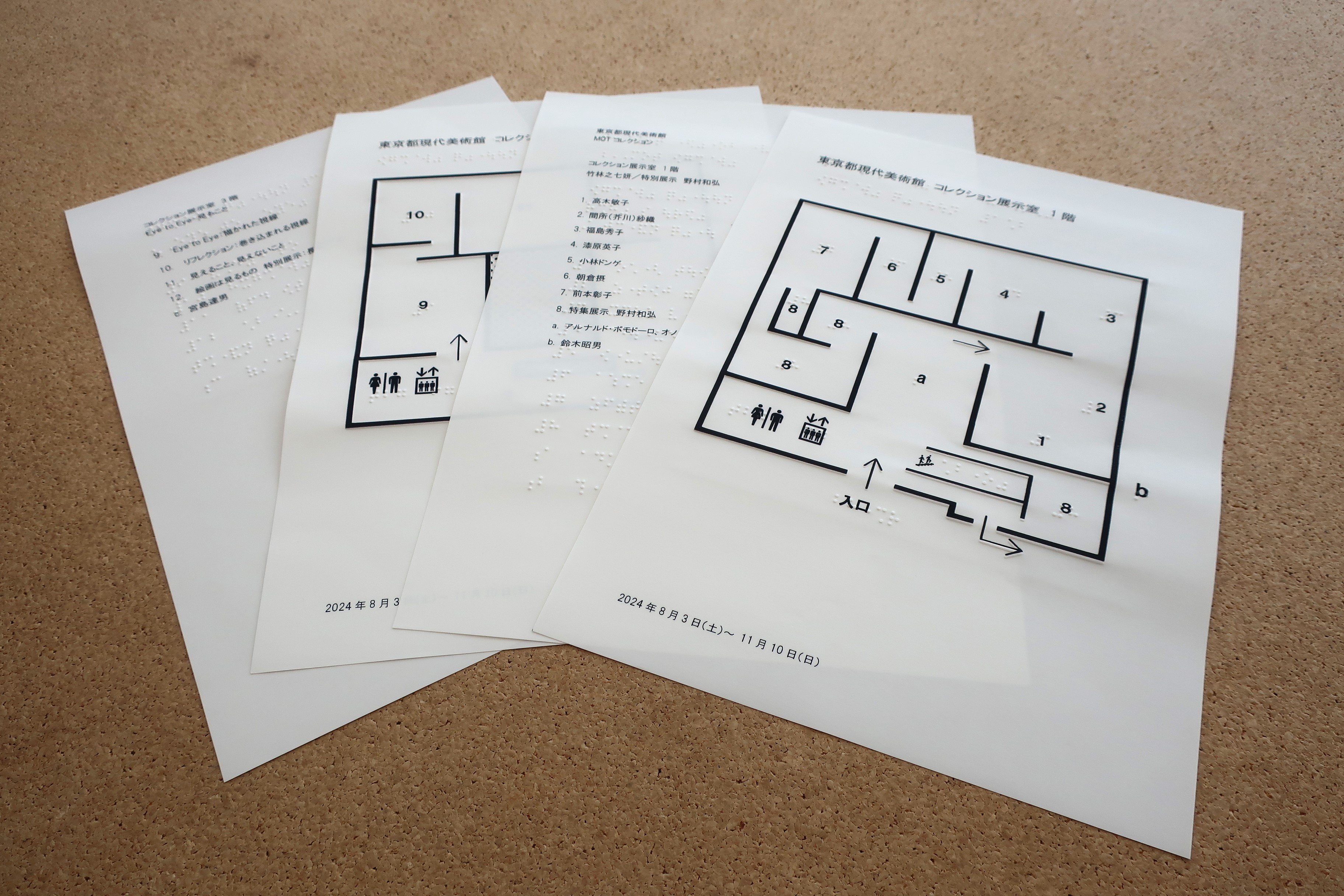 視覚障害のある方にご活用いただけるよう、開催中の「MOTコレクション 竹林之七妍/特集展示 野村和弘/Eye to Eye—見ること」展の触察フロアマップを作成しました。本マップでは、大まかな作品配置と作家名などが墨字と点字等で確認できます。